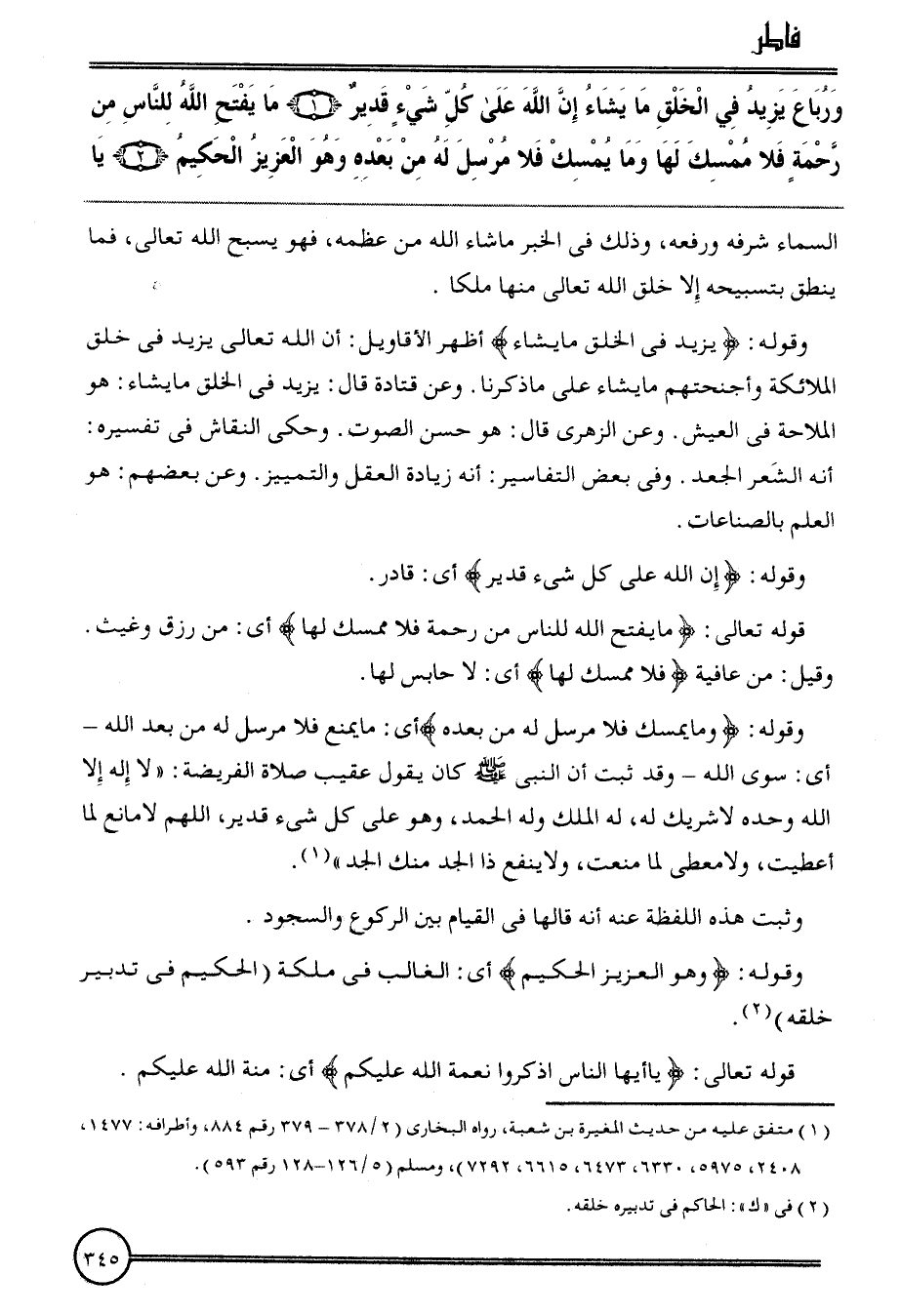 {وَربَاع يزِيد فِي الْخلق مَا يَشَاء إِن الله على كل شَيْء قدير (1) مَا يفتح الله للنَّاس من رَحْمَة فَلَا مُمْسك لَهَا وَمَا يمسك فَلَا مُرْسل لَهُ من بعده وَهُوَ الْعَزِيز الْحَكِيم (2) يَا} السَّمَاء شرفه وَرَفعه، وَذَلِكَ فِي الْخَبَر مَا شَاءَ الله من عظمه، فَهُوَ يسبح الله تَعَالَى، فَمَا ينْطق بتسبيحه إِلَّا خلق الله تَعَالَى مِنْهَا ملكا.