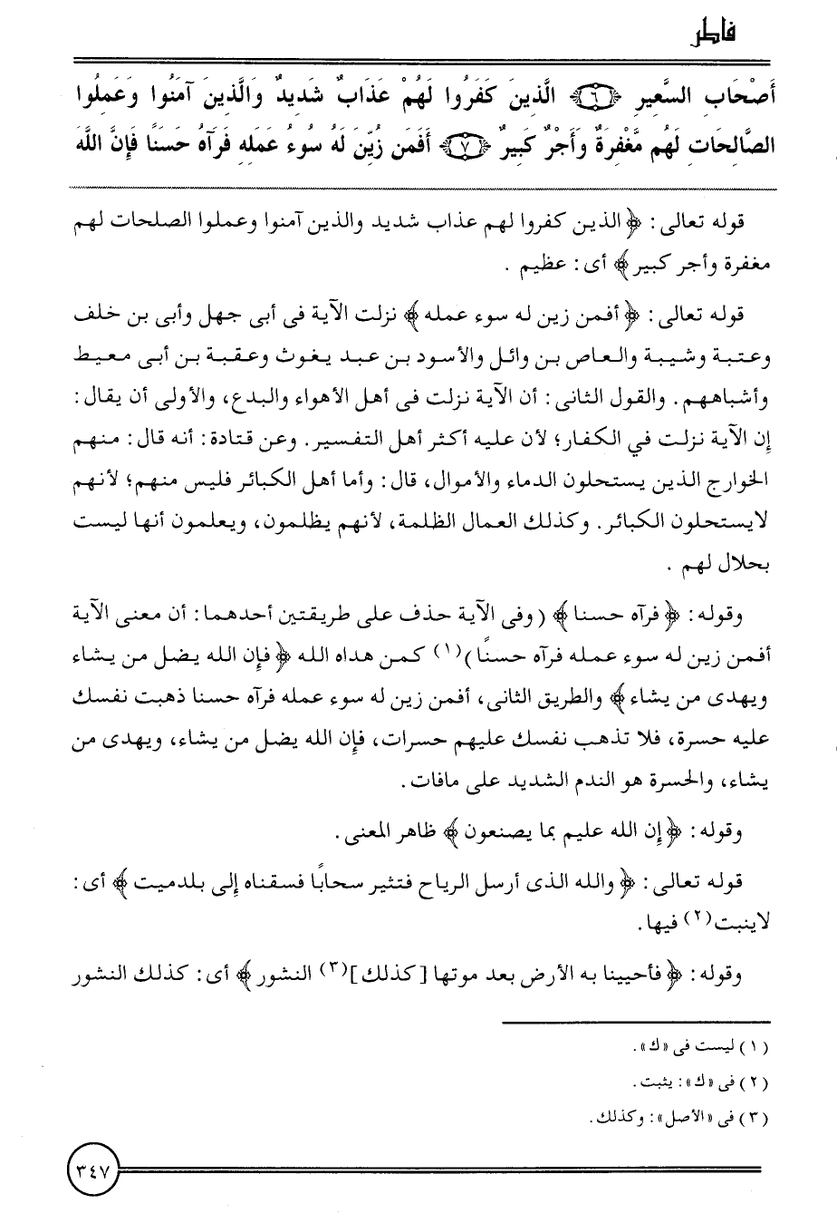قَوْله تَعَالَى: {أَفَمَن زين لَهُ سوء عمله} نزلت الْآيَة فِي أبي جهل وَأبي بن خلف وَعتبَة وَشَيْبَة وَالْعَاص بن وَائِل وَالْأسود بن عبد يَغُوث وَعقبَة بن أبي معيط وأشباههم. وَالْقَوْل الثَّانِي: أَن الْآيَة نزلت فِي أهل الْأَهْوَاء والبدع، وَالْأولَى أَن يُقَال: إِن الْآيَة نزلت فِي الْكفَّار؛ لِأَن عَلَيْهِ أَكثر أهل التَّفْسِير. وَعَن قَتَادَة: أَنه قَالَ: مِنْهُم الْخَوَارِج الَّذين يسْتَحلُّونَ الدِّمَاء وَالْأَمْوَال، قَالَ: وَأما أهل الْكَبَائِر فَلَيْسَ مِنْهُم؛ لأَنهم لَا يسْتَحلُّونَ الْكَبَائِر. وَكَذَلِكَ الْعمَّال الظلمَة، لأَنهم يظْلمُونَ، ويعلمون أَنَّهَا لَيست بحلال لَهُم.