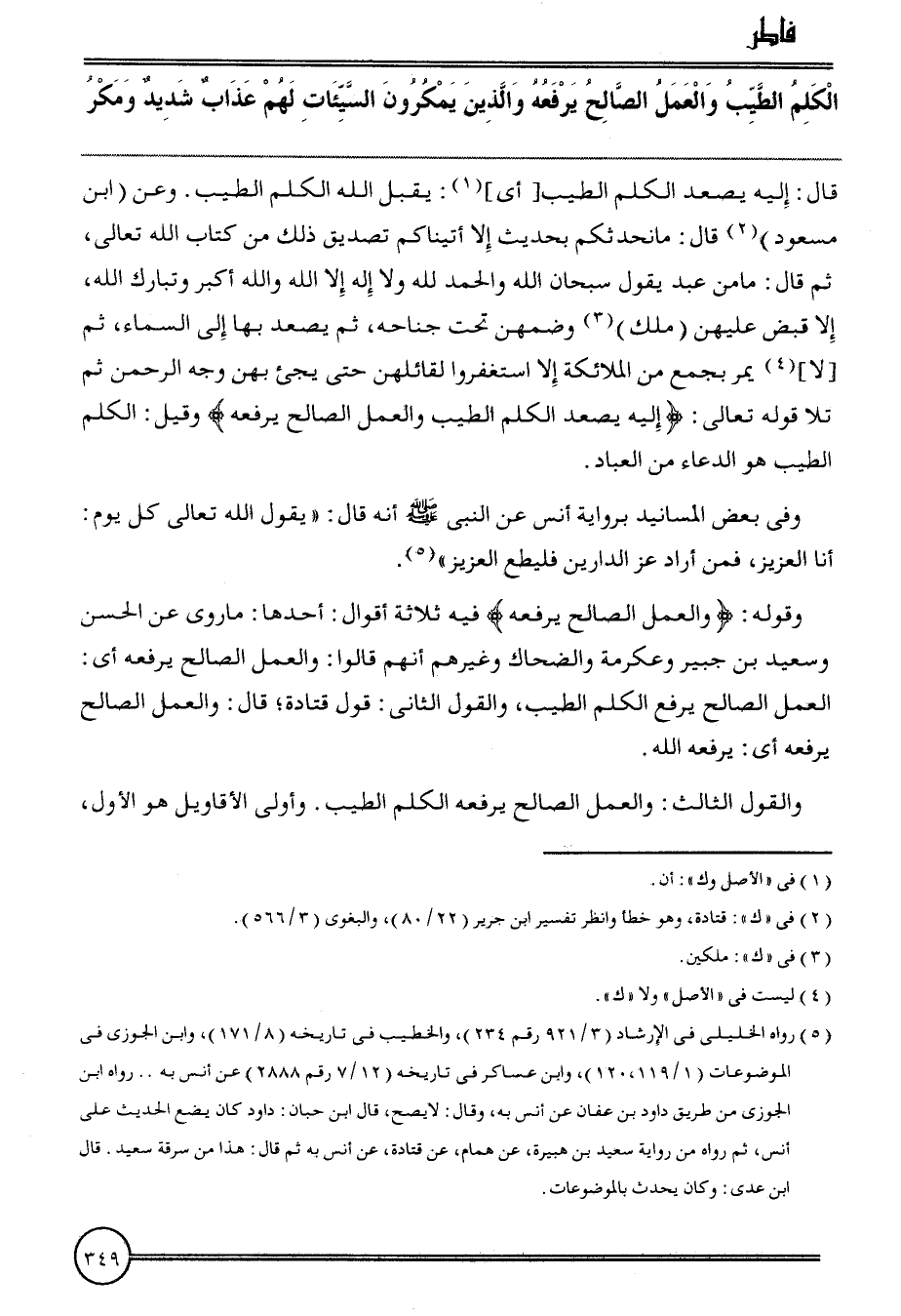 {الْكَلم الطّيب وَالْعَمَل الصَّالح يرفعهُ وَالَّذين يمكرون السَّيِّئَات لَهُم عَذَاب شَدِيد ومكر} قَالَ: إِلَيْهِ يصعد الْكَلم الطّيب [أَي] : يقبل الله الْكَلم الطّيب. وَعَن (ابْن مَسْعُود) قَالَ: مَا نحدثكم بِحَدِيث إِلَّا أَتَيْنَاكُم تَصْدِيق ذَلِك من كتاب الله تَعَالَى، ثمَّ قَالَ: مَا من عبد يَقُول سُبْحَانَ الله وَالْحَمْد لله وَلَا إِلَه إِلَّا الله وَالله أكبر وتبارك الله، إِلَّا قبض عَلَيْهِنَّ (ملك) وضمهن تَحت جنَاحه، ثمَّ يصعد بهَا إِلَى السَّمَاء، ثمَّ [لَا] يمر بِجمع من الْمَلَائِكَة إِلَّا اسْتَغْفرُوا لِقَائِلِهِنَّ حَتَّى يَجِيء بِهن وَجه الرَّحْمَن ثمَّ تَلا قَوْله تَعَالَى: {إِلَيْهِ يصعد الْكَلم الطّيب وَالْعَمَل الصَّالح يرفعهُ} وَقيل: الْكَلم الطّيب هُوَ الدُّعَاء من الْعباد.