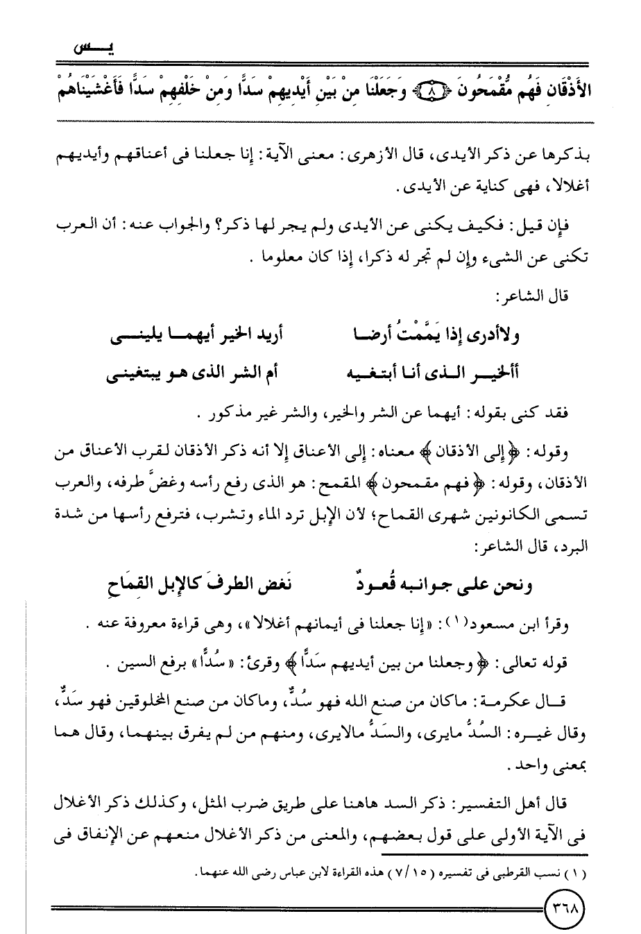 {الأذقان فهم مقحمون (8) وَجَعَلنَا من بَين أَيْديهم سدا وَمن خَلفهم سدا فأغشيناهم} بذكرها عَن ذكر الْأَيْدِي، قَالَ الْأَزْهَرِي: معنى الْآيَة: إِنَّا جعلنَا فِي أَعْنَاقهم وأيديهم أغلالا، فَهِيَ كِنَايَة عَن الْأَيْدِي.