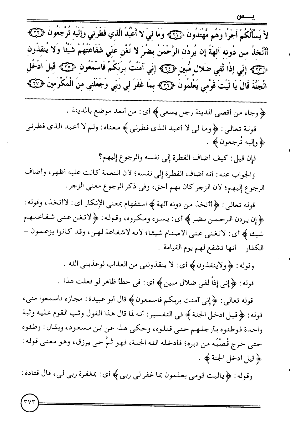 {لَا يسألكم أجرا وهم مهتدون (21) وَمَا لي لَا أعبد الَّذِي فطرني وَإِلَيْهِ ترجعون (22) أأتخذ من دونه آلِهَة إِن يردن الرَّحْمَن بضر لَا تغن عني شفاعتهم شَيْئا وَلَا ينقذون (23) إِنِّي إِذا لفي ضلال مُبين (24) إِنِّي آمَنت بربكم فاسمعون (25) قيل ادخل الْجنَّة قَالَ يَا لَيْت قومِي يعلمُونَ (26) بِمَا غفر لي رَبِّي وَجَعَلَنِي من الْمُكرمين (27) } {وَجَاء من أقْصَى الْمَدِينَة رجل يسْعَى} أَي: من أبعد مَوضِع بِالْمَدِينَةِ.