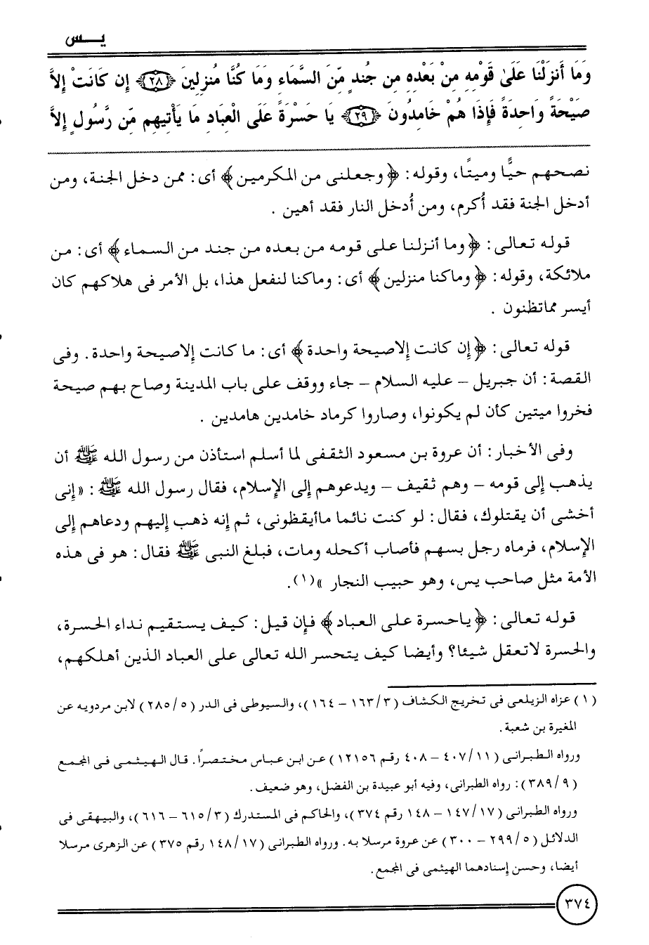 وَفِي الْأَخْبَار: أَن عُرْوَة بن مَسْعُود الثَّقَفِيّ لما أسلم اسْتَأْذن من رَسُول الله أَن يذهب لى قومه وهم ثَقِيف ويدعوهم إِلَى الْإِسْلَام، فَقَالَ رَسُول الله: " إِنِّي أخْشَى أَن يَقْتُلُوك، فَقَالَ: لَو كنت نَائِما مَا أيقظوني، ثمَّ إِنَّه ذهب إِلَيْهِم ودعاهم إِلَى الْإِسْلَام، فَرَمَاهُ رجل بِسَهْم فَأصَاب أكحله وَمَات، فَبلغ النَّبِي فَقَالَ: هُوَ فِي هَذِه الْأمة مثل صَاحب يس، وَهُوَ حبيب النجار ".