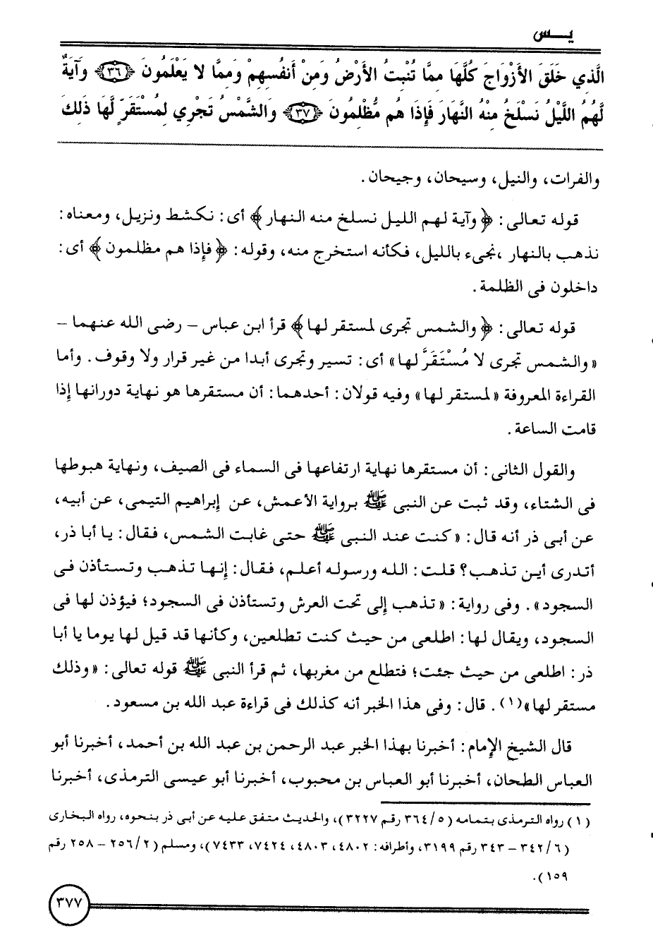 قَوْله تَعَالَى: {وَالشَّمْس تجْرِي لمستقر لَهَا} قَرَأَ ابْن عَبَّاس رَضِي الله عَنْهُمَا " وَالشَّمْس تجْرِي لمستقر لَهَا " أَي: تسير وتجري أبدا من غير قَرَار وَلَا وقُوف. وَأما الْقِرَاءَة الْمَعْرُوفَة " لمستقر لَهَا " وَفِيه قَولَانِ: أَحدهمَا: أَن مستقرها هُوَ نِهَايَة دورانها إِذا قَامَت السَّاعَة.