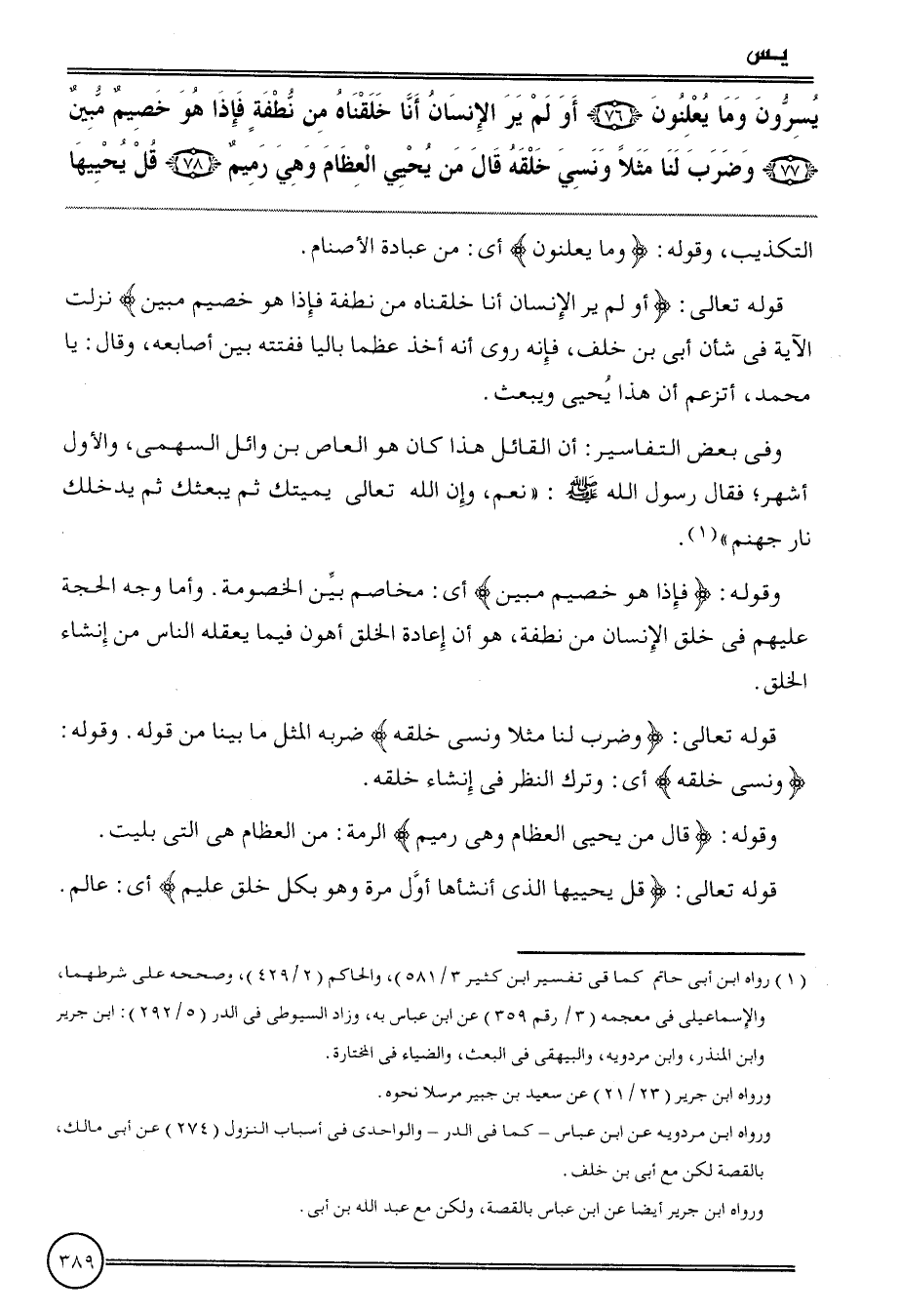 قَوْله تَعَالَى: {أَو لم ير الْإِنْسَان أَنا خلقناه من نُطْفَة فَإِذا هُوَ خصيم مُبين} نزلت الْآيَة فِي شَأْن أبي بن خلف، فَإِنَّهُ رُوِيَ أَنه أَخذ عظما بَالِيًا ففتته بَين أَصَابِعه، وَقَالَ: يَا مُحَمَّد، أتزعم أَن هَذَا يحيي وَيبْعَث.