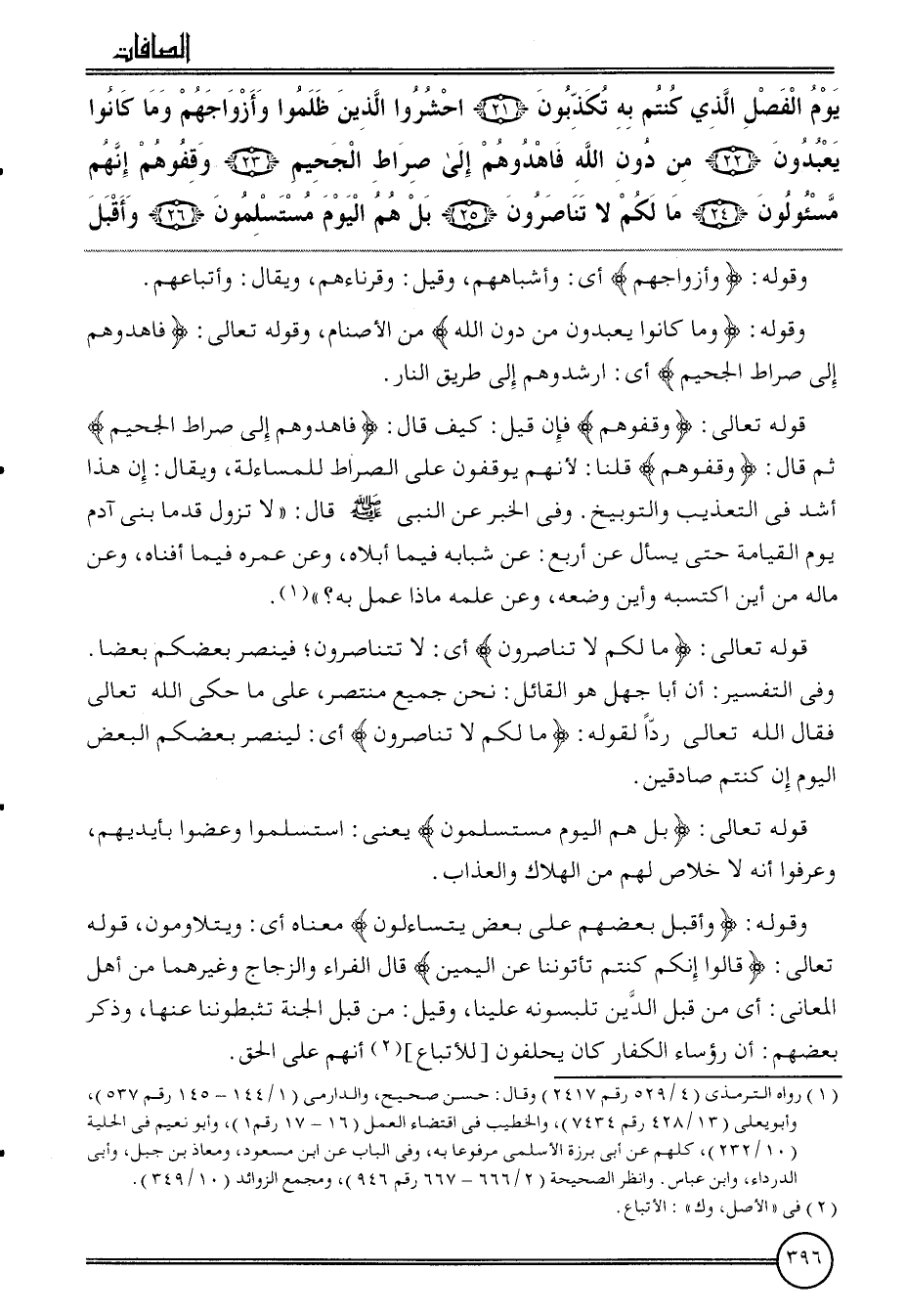 قَوْله تَعَالَى: {وقفوهم} فَإِن قيل: كَيفَ قَالَ: (فاهدوهم إِلَى صِرَاط الْجَحِيم) ثمَّ قَالَ: {وقفوهم} قُلْنَا: لأَنهم يوقفون على الصِّرَاط للمساءلة، وَيُقَال: إِن هَذَا أَشد فِي التعذيب والتوبيخ. وَفِي الْخَيْر عَن النَّبِي قَالَ: " لَا تَزُول قدما بني آدم يَوْم الْقِيَامَة حَتَّى يسْأَل عَن أَربع: عَن شبابه فِيمَا أبلاه، وَعَن عمره فِيمَا أفناه، وَعَن مَاله من أَيْن اكْتَسبهُ وَأَيْنَ وَضعه، وَعَن علمه مَاذَا فعل بِهِ؟ ".