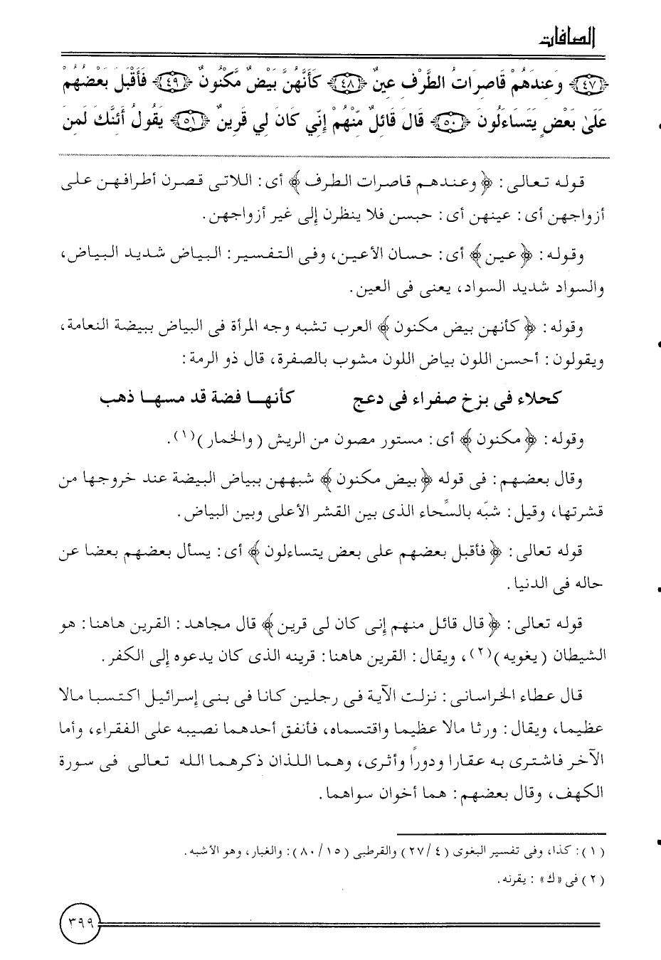 ( {47) وَعِنْدهم قاصرات الطّرف عين (48) كأنهن بيض مَكْنُون (49) فَأقبل بَعضهم على بعض يتساءلون (50) قَالَ قَائِل مِنْهُم إِنِّي كَانَ لي قرين (51) يَقُول أئنك لمن}