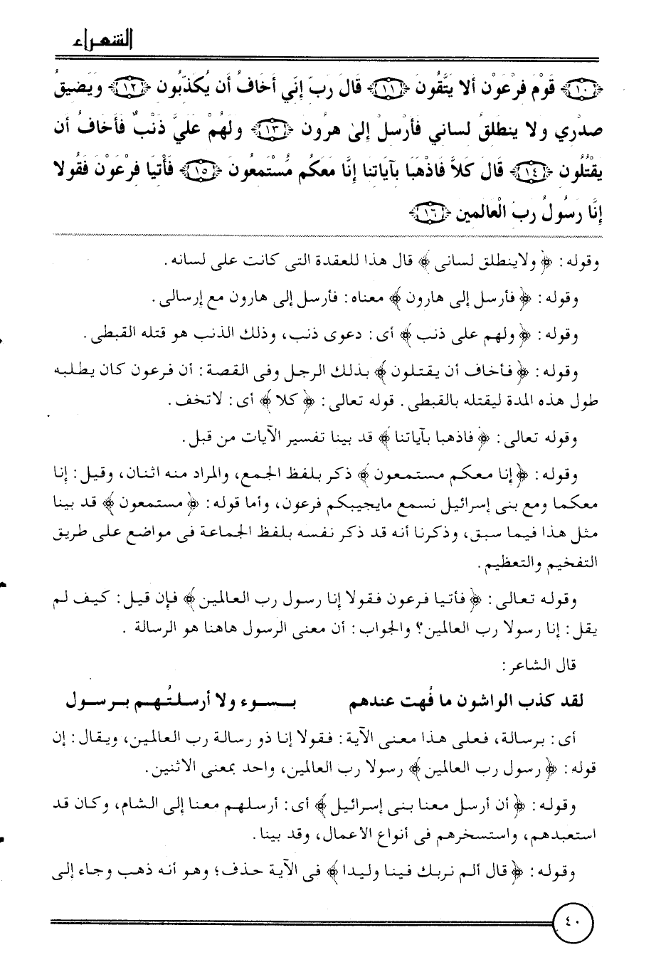 ( {10) قوم فِرْعَوْن أَلا يَتَّقُونَ (11) قَالَ رب إِنِّي أَخَاف أَن يكذبُون (12) ويضيق صَدْرِي وَلَا ينْطَلق لساني فَأرْسل إِلَى هرون (13) وَلَهُم عَليّ ذَنْب فَأَخَاف أَن يقتلُون (14) قَالَ كلا فاذهبا بِآيَاتِنَا إِنَّا مَعكُمْ مستمعون (15) فَأتيَا فِرْعَوْن فقولا إِنَّا رَسُول رب الْعَالمين (16)
