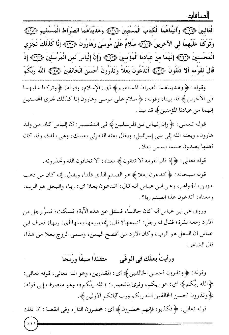 {الغالبين (116) وآتيناهما الْكتاب المستبين (117) وهديناهما الصِّرَاط الْمُسْتَقيم (118) وَتَركنَا عَلَيْهِمَا فِي الآخرين (119) سَلام على مُوسَى وَهَارُون (120) إِنَّا كَذَلِك نجزي الْمُحْسِنِينَ (121) إنَّهُمَا من عبادنَا الْمُؤمنِينَ (122) وَإِن إلْيَاس لمن الْمُرْسلين (123) إِذْ قَالَ لِقَوْمِهِ أَلا تَتَّقُون (124) أَتَدعُونَ بعلا وتذرون أحسن الْخَالِقِينَ (125) الله ربكُم}