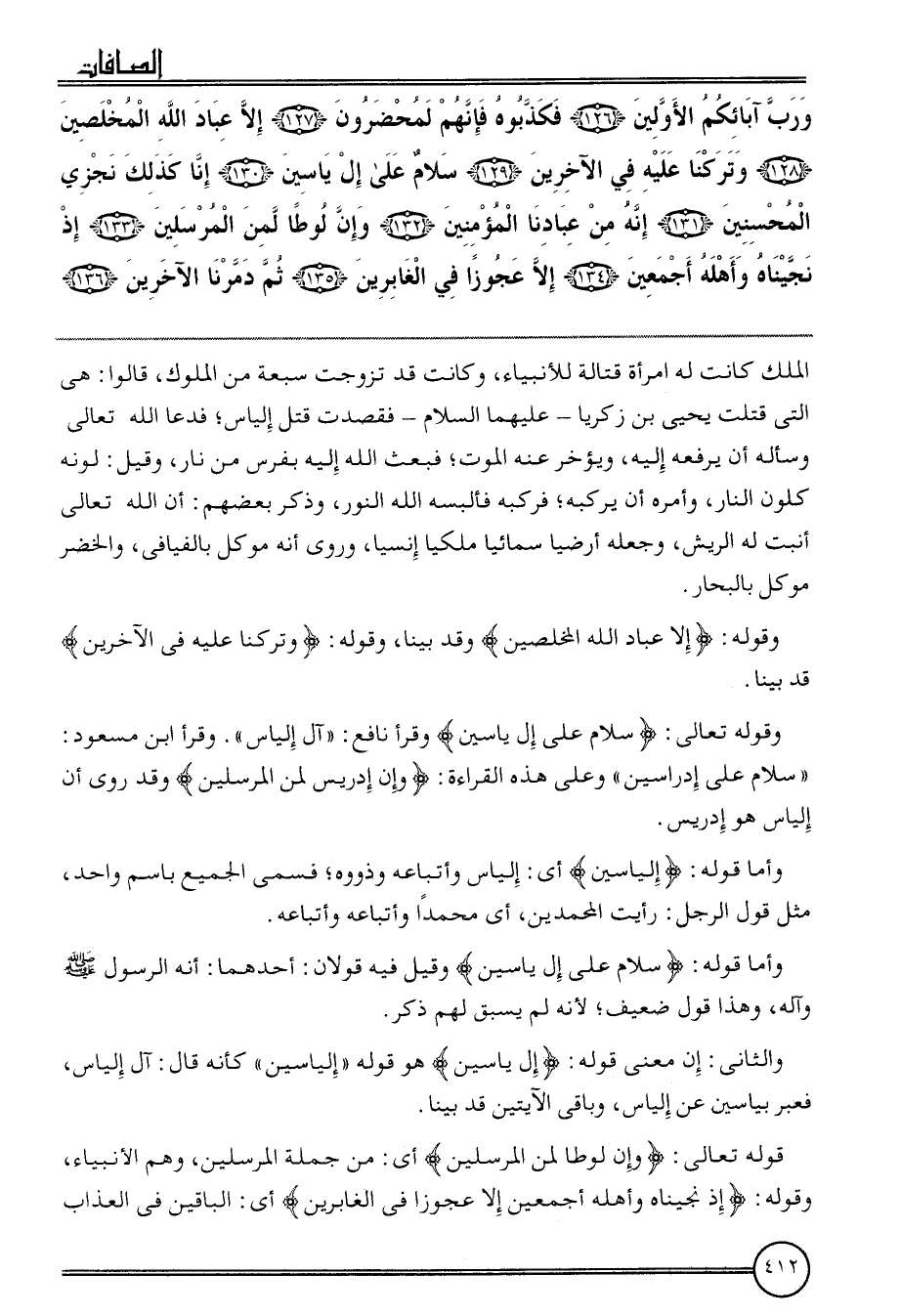 {وَرب آبائكم الْأَوَّلين (126) فَكَذبُوهُ فَإِنَّهُم لمحضرون (127) إِلَّا عباد الله المخلصين (128) وَتَركنَا عَلَيْهِ فِي الآخرين (129) سَلام على إل ياسين (130) إِنَّا كَذَلِك نجزي الْمُحْسِنِينَ (131) إِنَّه من عبادنَا الْمُؤمنِينَ (132) وَإِن لوطا لمن الْمُرْسلين (133) إِذْ نجيناه وَأَهله أَجْمَعِينَ (134) إِلَّا عجوزا فِي الغابرين (135) ثمَّ دمرنا الآخرين (136) الْملك كَانَت لَهُ امْرَأَة قتالة للأنبياء، وَكَانَت قد تزوجت سَبْعَة من الْمُلُوك، قَالُوا: هِيَ الَّتِي قتلت يحيى بن زَكَرِيَّا عَلَيْهِمَا السَّلَام فقصدت قتل إلْيَاس؛ فَدَعَا الله تَعَالَى وَسَأَلَهُ أَن يرفعهُ إِلَيْهِ، وَيُؤَخر عَنهُ الْمَوْت؛ فَبعث الله إِلَيْهِ بفرس من نَار، وَقيل: لَونه كلون النَّار، وَأمره أَن يركبه؛ فَرَكبهُ فألبسه الله النُّور، وَذكر بَعضهم: أَن الله تَعَالَى أنبت لَهُ الريش، وَجعله أرضياً سمائيا ملكيا إنسيا، وروى أَنه مُوكل بالفيافي، وَالْخضر مُوكل بالبحار.