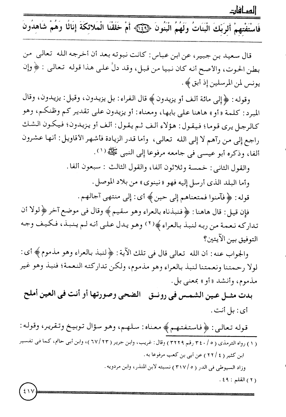 وَقَوله: {إِلَى مائَة ألف أَو يزِيدُونَ} قَالَ الْفراء: بل يزِيدُونَ، وَقيل: يزِيدُونَ، وَقَالَ الْمبرد: كلمة " أَو " هَا هُنَا على بَابهَا، وَمَعْنَاهُ: أَو يزِيدُونَ على تقديركم وظنكم، وَهُوَ كَالرّجلِ يرى فوما؛ فَيَقُول: هَؤُلَاءِ ألف ثمَّ يَقُول: ألف أَو يزِيدُونَ؛ فَيكون الشَّك رَاجع إِلَى من رَآهُمْ لَا إِلَى الله تَعَالَى، وَأما قدر الزِّيَادَة فأشهر الْأَقَاوِيل: أَنَّهَا عشرُون ألفا، وَذكره أَبُو عِيسَى فِي جَامعه مَرْفُوعا إِلَى النَّبِي.