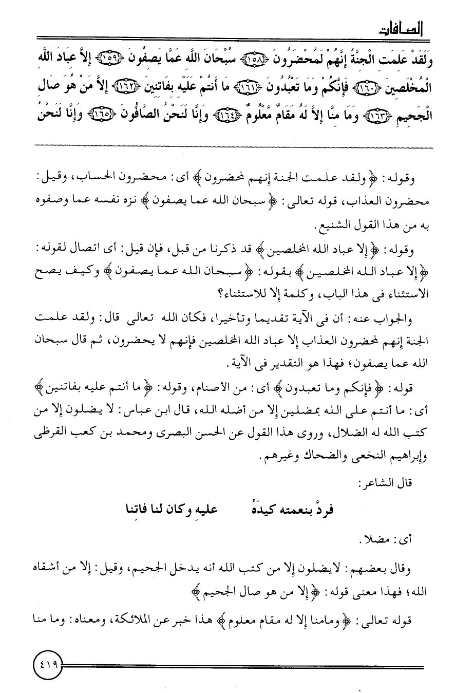 {وَلَقَد علمت الْجنَّة إِنَّهُم لمحضرون (158) سُبْحَانَ الله عَمَّا يصفونَ (159) إِلَّا عباد الله المخلصين (160) فَإِنَّكُم وَمَا تَعْبدُونَ (161) مَا أَنْتُم عَلَيْهِ بفاتنين (162) إِلَّا من هُوَ صال الْجَحِيم (163) وَمَا منا إِلَّا لَهُ مقَام مَعْلُوم (164) وَإِنَّا لنَحْنُ الصافون (165) وَإِنَّا لنَحْنُ}