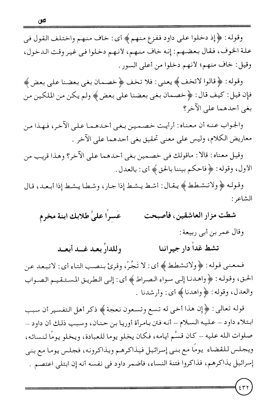 وَقيل مَعْنَاهُ: قَالَا: مَا قَوْلك فِي خصمين بغى أَحدهمَا على الآخر؟ وَهَذَا قريب من الأول، وَقَوله: {فاحكم بَيْننَا بِالْحَقِّ} أَي: بِالْعَدْلِ.