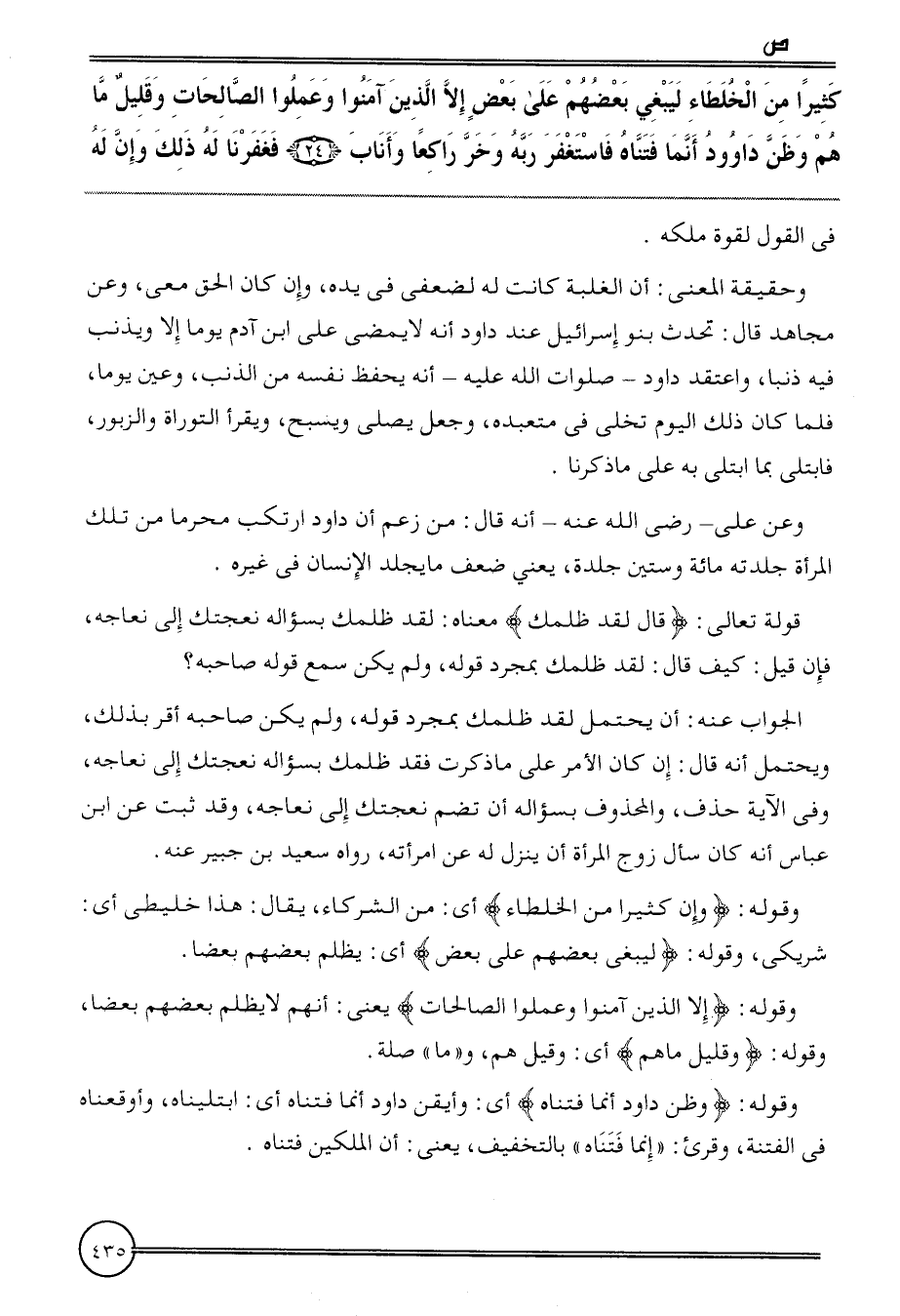 {كثيرا من الخلطاء ليبغي بَعضهم على بعض إِلَّا الَّذين آمنُوا وَعمِلُوا الصَّالِحَات وَقَلِيل مَا هم وَظن دَاوُود أَنما فتناه فَاسْتَغْفر ربه وخر رَاكِعا وأناب (24) فغفرنا لَهُ ذَلِك وَإِن لَهُ} فِي القَوْل لقُوَّة ملكه.