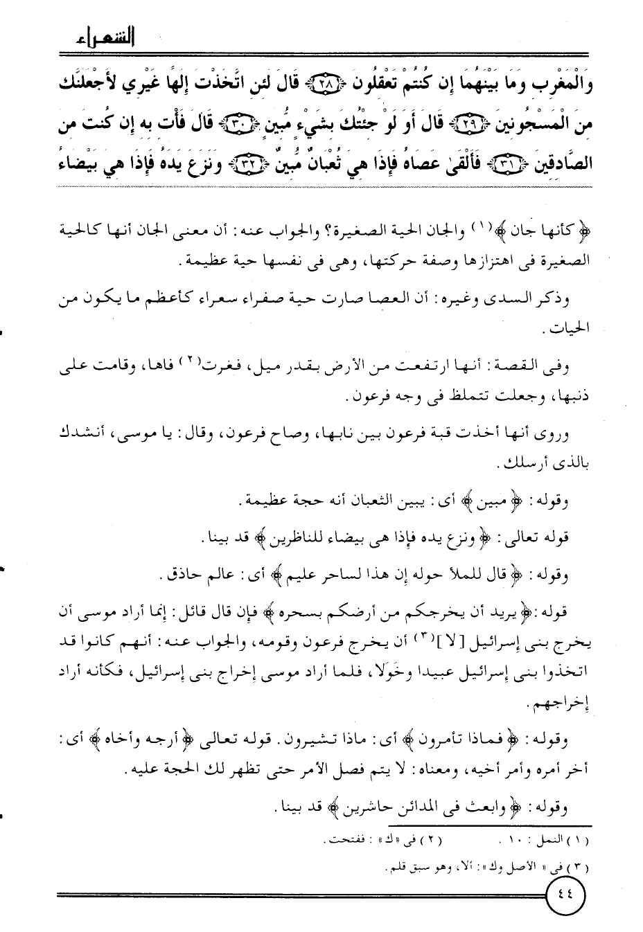 {وَالْمغْرب وَمَا بَينهمَا إِن كُنْتُم تعقلون (28) قَالَ لَئِن اتَّخذت إِلَهًا غَيْرِي لأجعلنك من المسجونين (29) قَالَ أَو لَو جئْتُك بِشَيْء مُبين (30) قَالَ فأت بِهِ إِن كنت من الصَّادِقين (31) فَألْقى عَصَاهُ فَإِذا هِيَ ثعبان مُبين (32) وَنزع يَده فَإِذا هِيَ بَيْضَاء