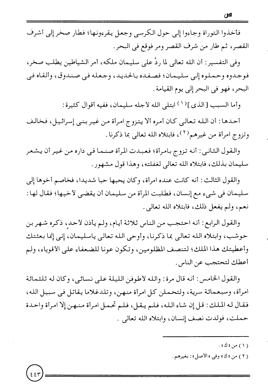 وَأما السَّبَب [الَّذِي] ابْتُلِيَ الله لأَجله سُلَيْمَان، فَفِيهِ أَقْوَال كَثِيرَة: