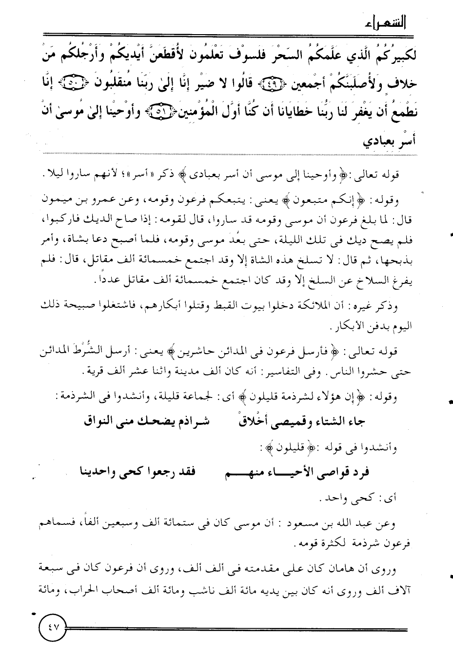 {لكبيركم الَّذِي علمكُم السحر فلسوف تعلمُونَ لأقطعن أَيْدِيكُم وأرجلكم من خلاف ولأصلبنكم أَجْمَعِينَ (49) قَالُوا لَا ضير إِنَّا إِلَى رَبنَا منقلبون (50) إِنَّا نطمع أَن يغْفر لنا رَبنَا خطايانا أَن كُنَّا أول الْمُؤمنِينَ (51) وأوحينا إِلَى مُوسَى أَن أسر بعبادي