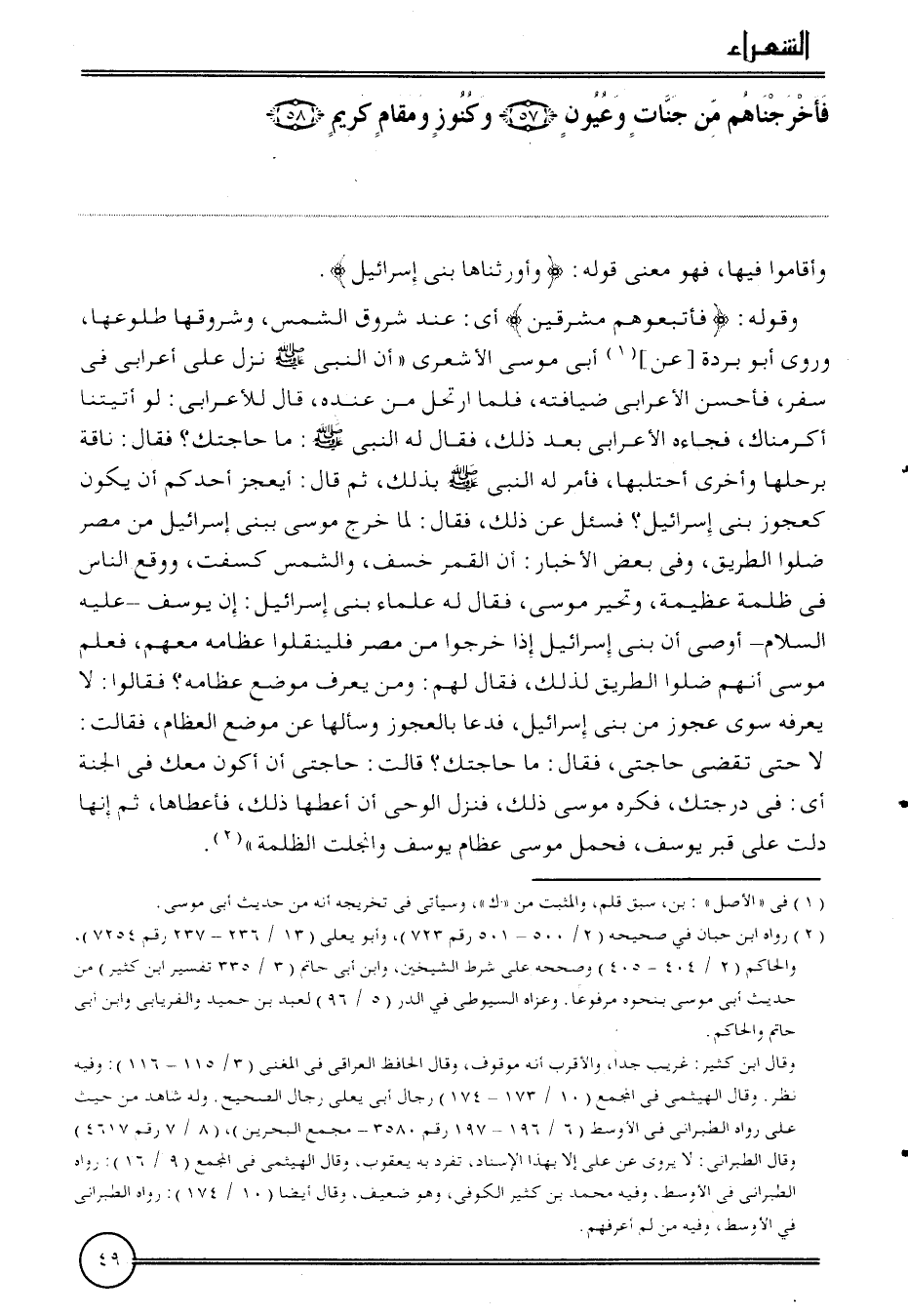وَقَوله: (فأتبعوهم مشرقين) أَي: عِنْد شروق الشَّمْس، وشروقها طُلُوعهَا، وروى أَبُو بردة [عَن] أبي مُوسَى الْأَشْعَرِيّ " أَن النَّبِي نزل على أَعْرَابِي فِي سفر، فَأحْسن الْأَعرَابِي ضيافته، فَلَمَّا ارتحل من عِنْده، قَالَ للأعرابي: لَو أَتَيْتنَا أكرمناك، فَجَاءَهُ الْأَعرَابِي بعد ذَلِك، فَقَالَ لَهُ النَّبِي: مَا حَاجَتك؟ فَقَالَ: نَاقَة برحلها وَأُخْرَى أحتلبها، فَأمر لَهُ النَّبِي بذلك، ثمَّ قَالَ: أَيعْجزُ أحدكُم أَن يكون كعجوز بني إِسْرَائِيل؟ فَسئلَ عَن ذَلِك، فَقَالَ: لما خرج مُوسَى ببني إِسْرَائِيل من مصر ضلوا الطَّرِيق، وَفِي بعض الْأَخْبَار: أَن الْقَمَر خسف، وَالشَّمْس كسفت، وَوَقع النَّاس فِي ظلمَة عَظِيمَة، وتحير مُوسَى، فَقَالَ لَهُ عُلَمَاء بني إِسْرَائِيل: إِن يُوسُف - عَلَيْهِ السَّلَام - أوصى أَن بني إِسْرَائِيل إِذا خَرجُوا من مصر فلينقلوا عِظَامه مَعَهم، فَعلم مُوسَى انهم ضلوا الطَّرِيق لذَلِك، فَقَالَ لَهُم: وَمن يعرف مَوضِع عِظَامه؟ فَقَالُوا: لَا يعرفهُ سوى عَجُوز من بني إِسْرَائِيل، فَدَعَا بالعجوز وسألها عَن مَوضِع الْعِظَام، فَقَالَت: لَا حَتَّى تقضي حَاجَتي، فَقَالَ: مَا حَاجَتك؟ قَالَت: حَاجَتي أَن أكون مَعَك فِي الْجنَّة أَي: فِي درجتك، فكره مُوسَى ذَلِك، فَنزل الْوَحْي أَن أعْطهَا ذَلِك، فَأَعْطَاهَا، ثمَّ إِنَّهَا دلّت على قبر يُوسُف، فَحمل مُوسَى عِظَام يُوسُف وانجلت الظلمَة ".