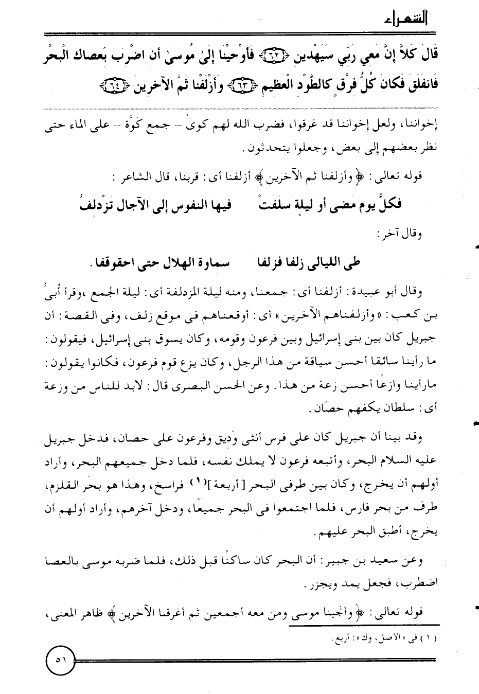 {قَالَ كلا إِن معي رَبِّي سيهيدين (62) فأوحينا إِلَى مُوسَى أَن أضْرب بعصاك الْبَحْر فانفلق فَكَانَ كل فرق كالطود الْعَظِيم (63) وأزلفنا ثمَّ الآخرين (64) إِخْوَاننَا، وَلَعَلَّ إِخْوَاننَا قد غرقوا، فَضرب الله لَهُم كوى - جمع كوَّة - على المَاء حَتَّى نظر بَعضهم إِلَى بعض، وَجعلُوا يتحدثون.