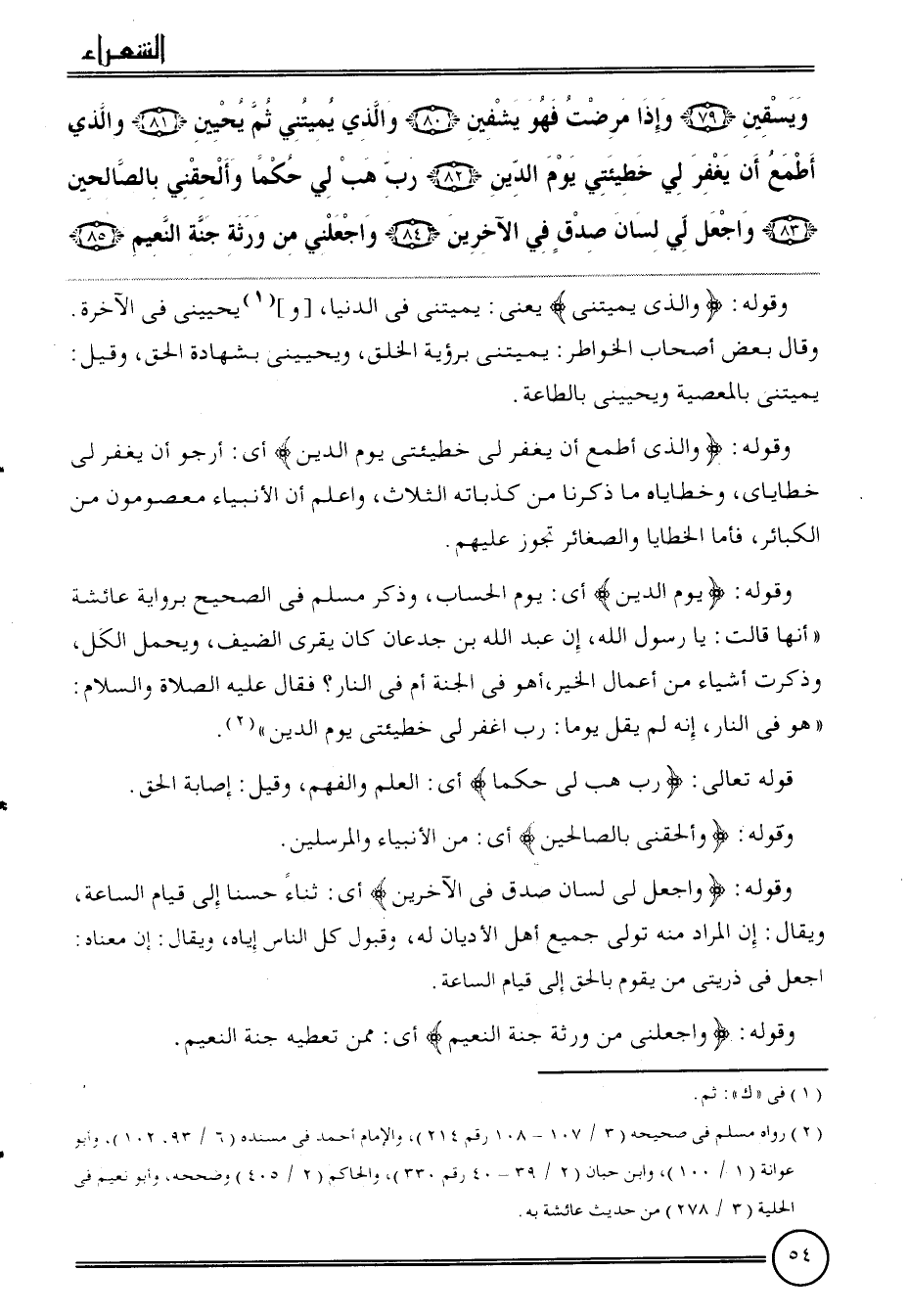 {ويسقين (79) وَإِذا مَرضت فَهُوَ يشفين (80) وَالَّذِي يميتني ثمَّ يحيين (81) وَالَّذِي أطمع أَن يفغر لي خطيئتي يَوْم الدّين (82) رب هَب لي حكما وألحقني بالصالحين (83) وَاجعَل لي لِسَان صدق فِي الآخرين (84) واجعلني من وَرَثَة جنَّة النَّعيم (85)