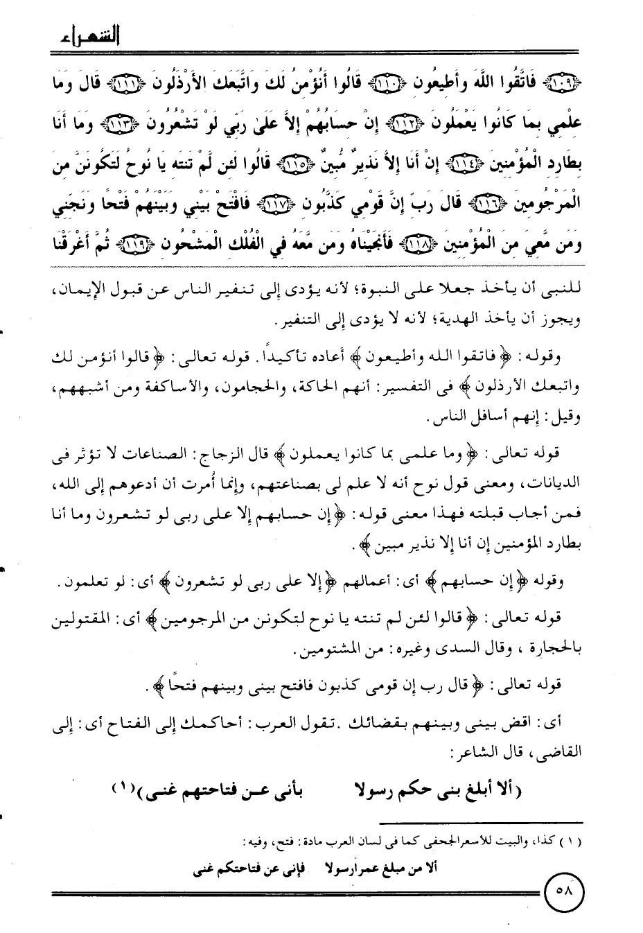 ( {109) فَاتَّقُوا الله وأطيعون (110) قَالُوا نؤمن لَك واتبعك الأرذلون (111) قَالَ وَمَا علمي بِمَا كَانُوا يعلمُونَ (112) إِن حسابهم إِلَّا على رَبِّي لَو تشعرون (113) وَمَا أَنا بطارد الْمُؤمنِينَ (114) إِن أَنا إِلَّا نَذِير مُبين (115) قَالُوا لَئِن لم تَنْتَهِ يَا نوح لتكونن من المرجومين (116) قَالَ رب إِن قومِي كذبون (117) فافتح بيني وَبينهمْ فتحا ونجني وَمن معي من الْمُؤمنِينَ (118) فأنجيناه وَمن مَعَه فِي الْفلك المشحون (119) ثمَّ أغرقنا للنَّبِي أَن يَأْخُذ جعلا على النُّبُوَّة؛ لِأَنَّهُ يُؤَدِّي إِلَى تنفير النَّاس عَن قبُول الْإِيمَان، وَيجوز أَن يَأْخُذ الْهَدِيَّة؛ لِأَنَّهُ لَا يُؤَدِّي إِلَى التنفير.