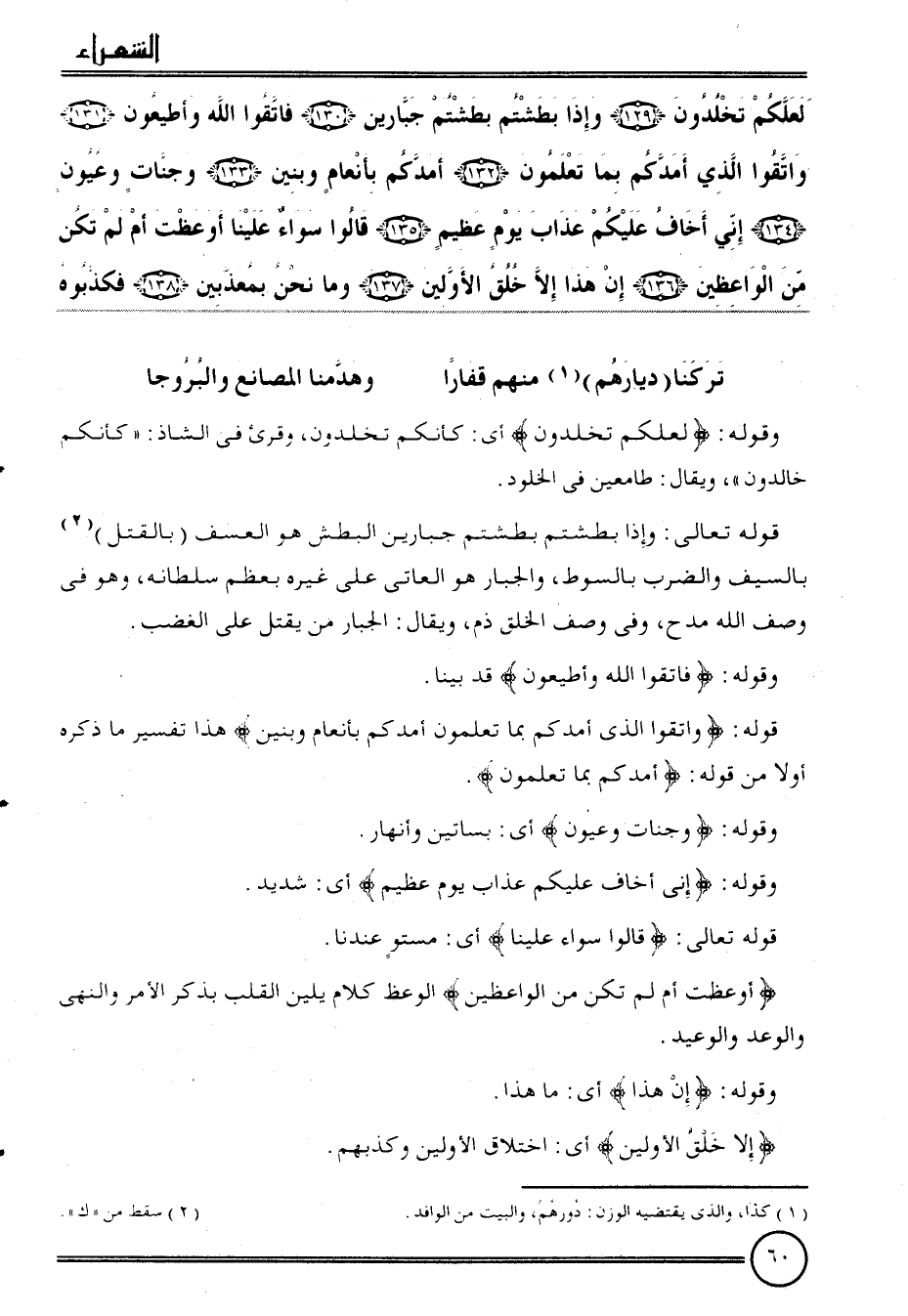 {لَعَلَّكُمْ تخلدون (129) وَإِذا بطشتم بطشتم جبارين (130) فَاتَّقُوا الله وأطيعون (131) وَاتَّقوا الَّذِي أمدكم بِمَا تعلمُونَ (132) أمدكم بأنعام وبنين (133) وجنات وعيون (134) إِنِّي أَخَاف عَلَيْكُم عَذَاب يَوْم عَظِيم (135) قَالُوا سَوَاء علينا أوعظت أم لم تكن من الواعظين (136) إِن هَذَا إِلَّا خلق الْأَوَّلين (137) وَمَا نَحن بمعذبين (138) فَكَذبُوهُ
