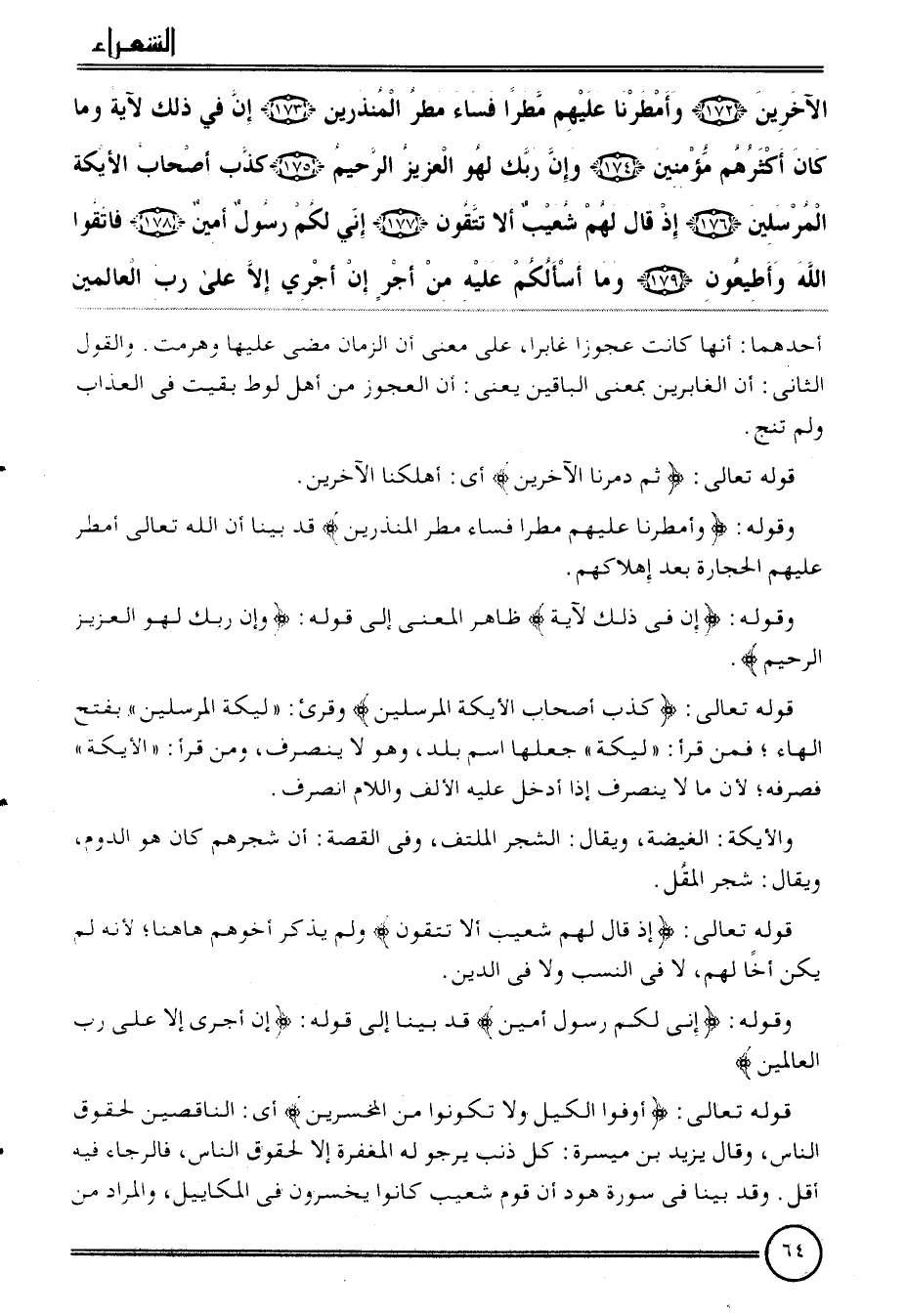 {الآخرين (172) وأمطرنا عَلَيْهِم مَطَرا فسَاء مطر الْمُنْذرين (173) إِن فِي ذَلِك لآيَة وَمَا كَانَ أَكْثَرهم مُؤمنين (174) وَإِن رَبك لَهو الْعَزِيز الرَّحِيم (175) كذب أَصْحَاب الأيكة الْمُرْسلين (176) إِذْ قَالَ لَهُم شُعَيْب أَلا تَتَّقُون (177) إِنِّي لكم رَسُول أَمِين (178) فَاتَّقُوا الله وأطيعون (179) وَمَا أَسأَلكُم عَلَيْهِ من أجر إِن أجري إِلَّا على رب الْعَالمين أَحدهمَا: أَنَّهَا كَانَت عَجُوز غابراً، على معنى أَن الزَّمَان مضى عَلَيْهَا وهرمت، وَالْقَوْل الثَّانِي: أَن الغابرين بِمَعْنى البَاقِينَ يَعْنِي: أَن الْعَجُوز من أهل لوط بقيت فِي الْعَذَاب وَلم تنج.