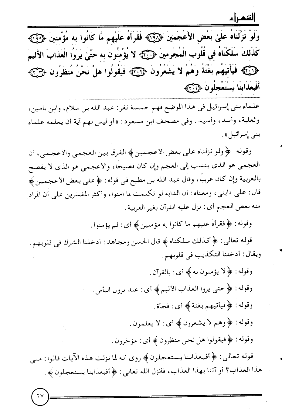 {وَلَو نزلناه على بعض الأعجمين (198) فقرأه عَلَيْهِم مَا كَانُوا بِهِ مُؤمنين (199) كَذَلِك سلكناه فِي قُلُوب الْمُجْرمين (200) لَا يُؤمنُونَ بِهِ حَتَّى يرَوا الْعَذَاب الْأَلِيم (201) فيأتيهم بَغْتَة وهم لَا يَشْعُرُونَ (202) فيقولوا هَل نَحن منظرون (203) أفبعذابنا يستعجلون (204) عُلَمَاء بني إِسْرَائِيل فِي هَذَا الْموضع فهم خَمْسَة نفر: عبد الله بن سَلام، وَابْن يَامِين، وثعلبة، وَأسد، وَأسيد. وَفِي مصحف ابْن مَسْعُود: " أَو لَيْسَ لَهُم آيَة أَن يُعلمهُ عُلَمَاء بني إِسْرَائِيل ".