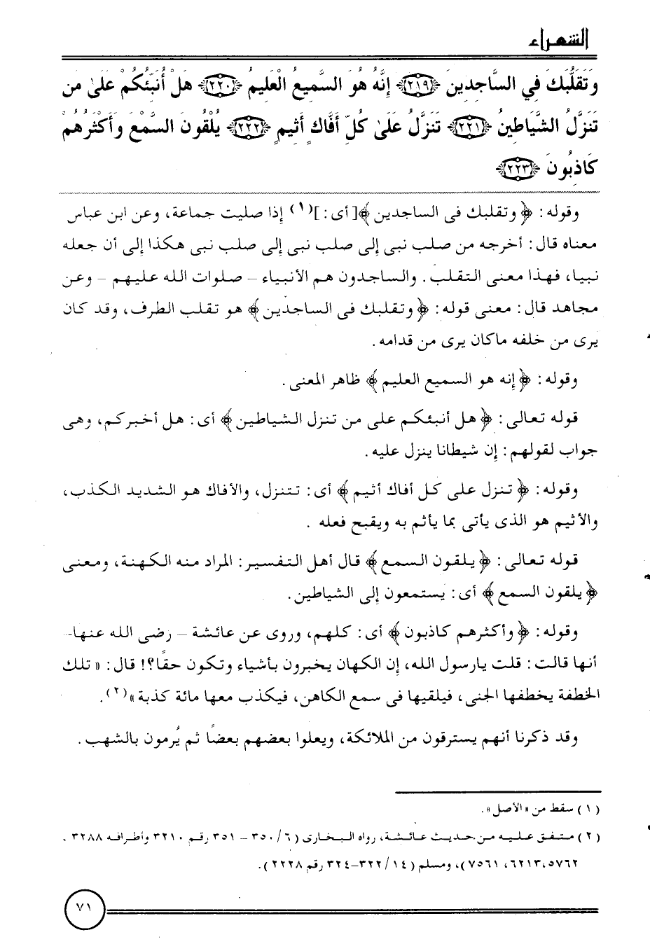 {وتقلبك فِي الساجدين (219) إِنَّه هُوَ السَّمِيع الْعَلِيم (220) هَل أنبئكم على من تنزل الشَّيَاطِين (221) تنزل على كل أفاك أثيم (222) يلقون السّمع وَأَكْثَرهم كاذبون (223) .