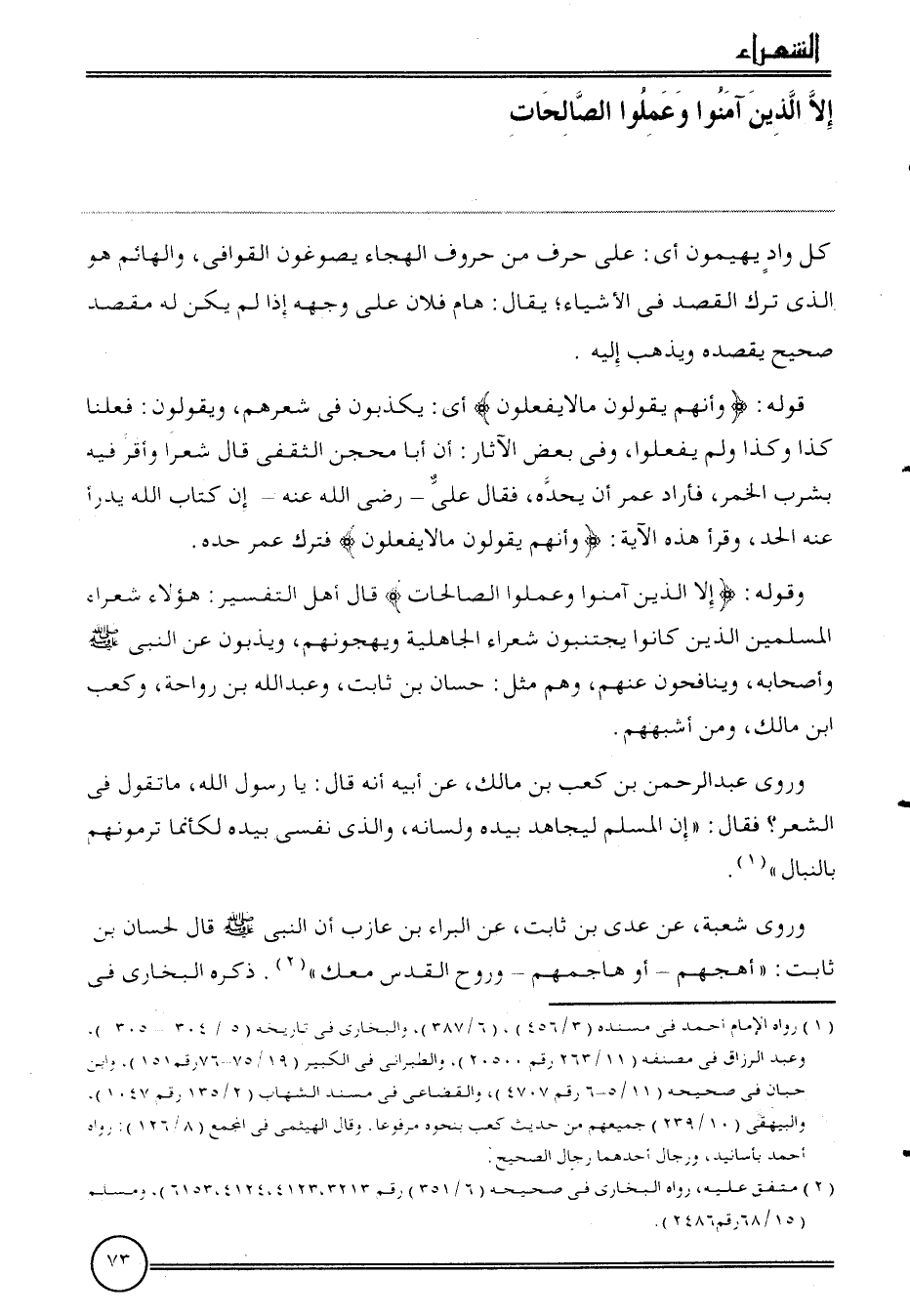 وَقَوله: {إِلَّا الَّذين آمنُوا وَعمِلُوا الصَّالِحَات} قَالَ أهل التَّفْسِير: هَؤُلَاءِ شعراء الْمُسلمين الَّذين كَانُوا يجتنبون شعراء الْجَاهِلِيَّة ويهجونهم، ويذبون عَن النَّبِي وَأَصْحَابه، وينافحون عَنْهُم، وهم مثل: حسان بن ثَابت، وَعبد الله بن رَوَاحَة، وَكَعب ابْن مَالك، وَمن أشبههم.