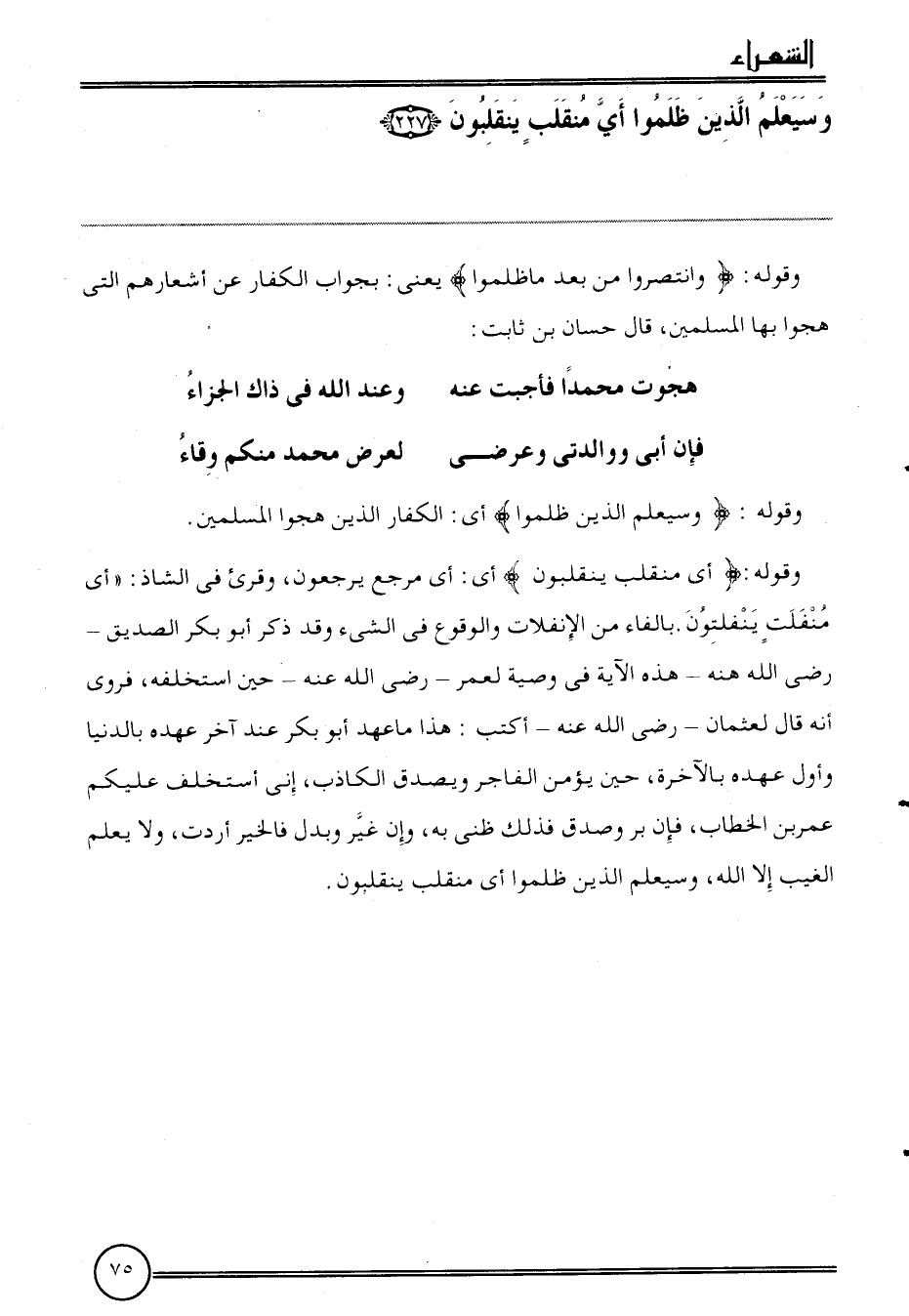وَقَوله: {وانتصروا من بعد مَا ظلمُوا} يَعْنِي: بِجَوَاب الْكفَّار عَن أشعارهم الَّتِي هجوا بهَا الْمُسلمين، قَالَ حسان بن ثَابت: