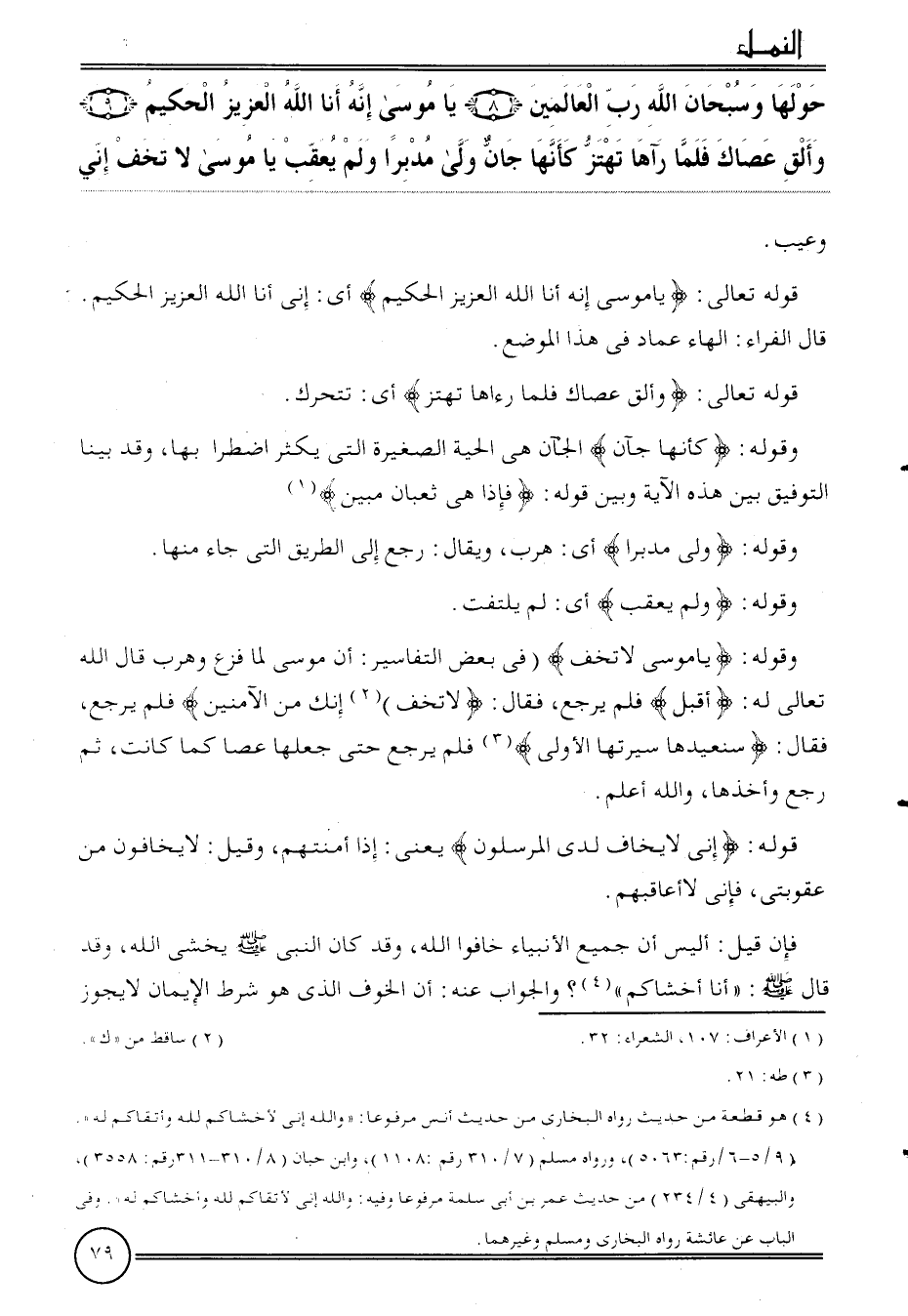 {حولهَا وَسُبْحَان الله رب الْعَالمين (8) يَا مُوسَى إِنَّه أَنا الله الْعَزِيز الْحَكِيم (9) وألق عصاك فَلَمَّا رَآهَا تهتز كَأَنَّهَا جَان ولى مُدبرا وَلم يعقب يَا مُوسَى لَا تخف إِنِّي وعيب.