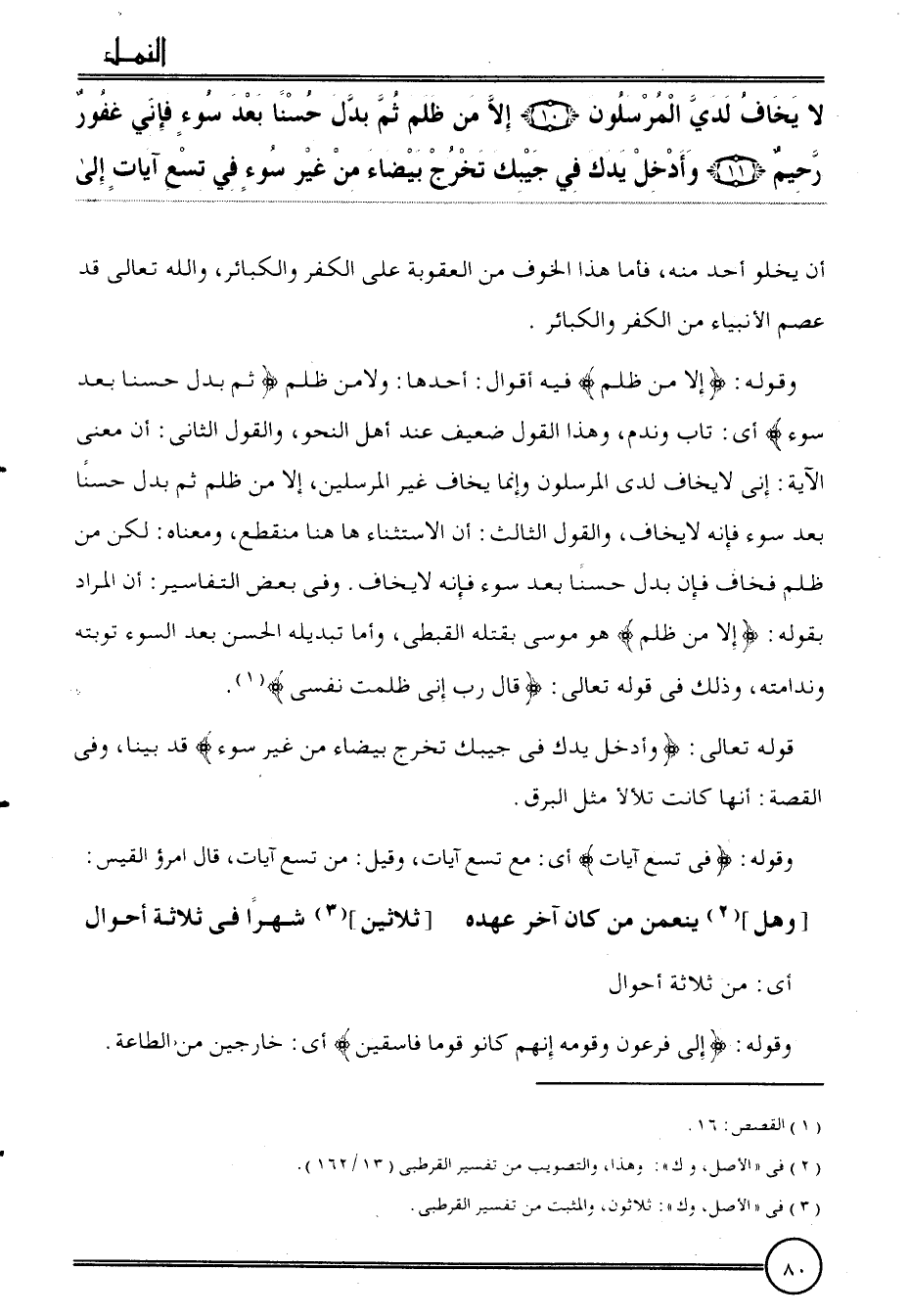 {لَا يخَاف لدي المُرْسَلُونَ (10) إِلَّا من ظلم ثمَّ بدل حسنا بعد سوء فَإِنِّي غَفُور رَحِيم (11) وَأدْخل يدك فِي جيبك تخرج بَيْضَاء من غير سوء فِي تسع آيَات إِلَى أَن يَخْلُو أحد مِنْهُ، فَأَما هَذَا الْخَوْف من الْعقُوبَة على الْكفْر والكبائر، وَالله تَعَالَى قد عصم الْأَنْبِيَاء من الْكفْر والكبائر.