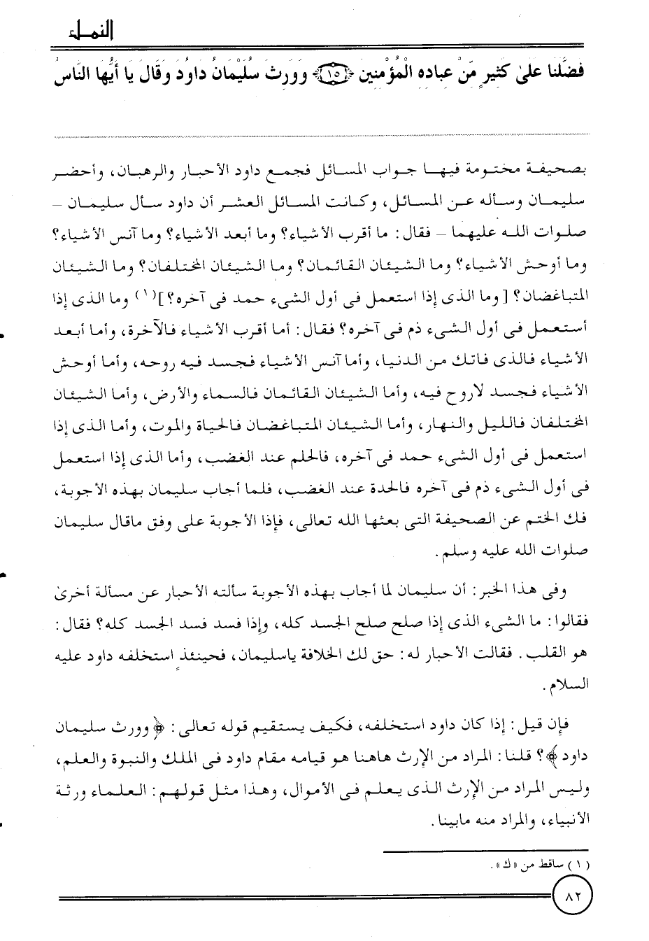 {فضلنَا على كثير من عباده الْمُؤمنِينَ (15) وَورث سُلَيْمَان دَاوُد وَقَالَ يَا أَيهَا النَّاس بِصَحِيفَة مختومة فِيهَا جَوَاب الْمسَائِل فَجمع دَاوُد الْأَحْبَار والرهبان، وأحضر سُلَيْمَان وَسَأَلَهُ عَن الْمسَائِل، وَكَانَت الْمسَائِل الْعشْر أَن دَاوُد سَأَلَ سُلَيْمَان - صلوَات الله عَلَيْهِمَا - فَقَالَ: مَا أقرب الْأَشْيَاء؟ وَمَا أبعد الْأَشْيَاء؟ وَمَا آنس الْأَشْيَاء؟ وَمَا أوحش الْأَشْيَاء؟ وَمَا الشيئان القائمان؟ وَمَا الشيئان المختلفان؟ وَمَا الشيئان المتباغضان؟ [وَمَا الَّذِي إِذا اسْتعْمل فِي أول الشَّيْء حمد فِي آخِره؟] وَمَا الَّذِي إِذا اسْتعْمل فِي أول الشَّيْء ذمّ فِي آخِره؟ فَقَالَ: أما أقرب الْأَشْيَاء فالآخرة، وَأما أبعد الْأَشْيَاء فَالَّذِي فاتك من الدُّنْيَا، وَأما آنس الْأَشْيَاء فجسد فِيهِ روحه، وَأما أوحش الْأَشْيَاء فجسد لَا روح فِيهِ، وَأما الشيئان القائمان فالسماء وَالْأَرْض، وَأما الشيئان المختلفان فالليل وَالنَّهَار، وَأما الشيئان المتباغضان فالحياة وَالْمَوْت، وَأما الَّذِي إِذا اسْتعْمل فِي أول الشَّيْء حمد فِي آخِره، فالحلم عِنْد الْغَضَب، وَأما الَّذِي إِذا اسْتعْمل فِي أول الشَّيْء ذمّ فِي آخِره فالحدة عِنْد الْغَضَب، فَلَمَّا أجَاب سُلَيْمَان بِهَذِهِ الْأَجْوِبَة، فك الْخَتْم عَن الصَّحِيفَة الَّتِي بعثها الله تَعَالَى، فَإِذا الْأَجْوِبَة على وفْق مَا قَالَ سُلَيْمَان صلوَات الله عَلَيْهِ وَسلم.