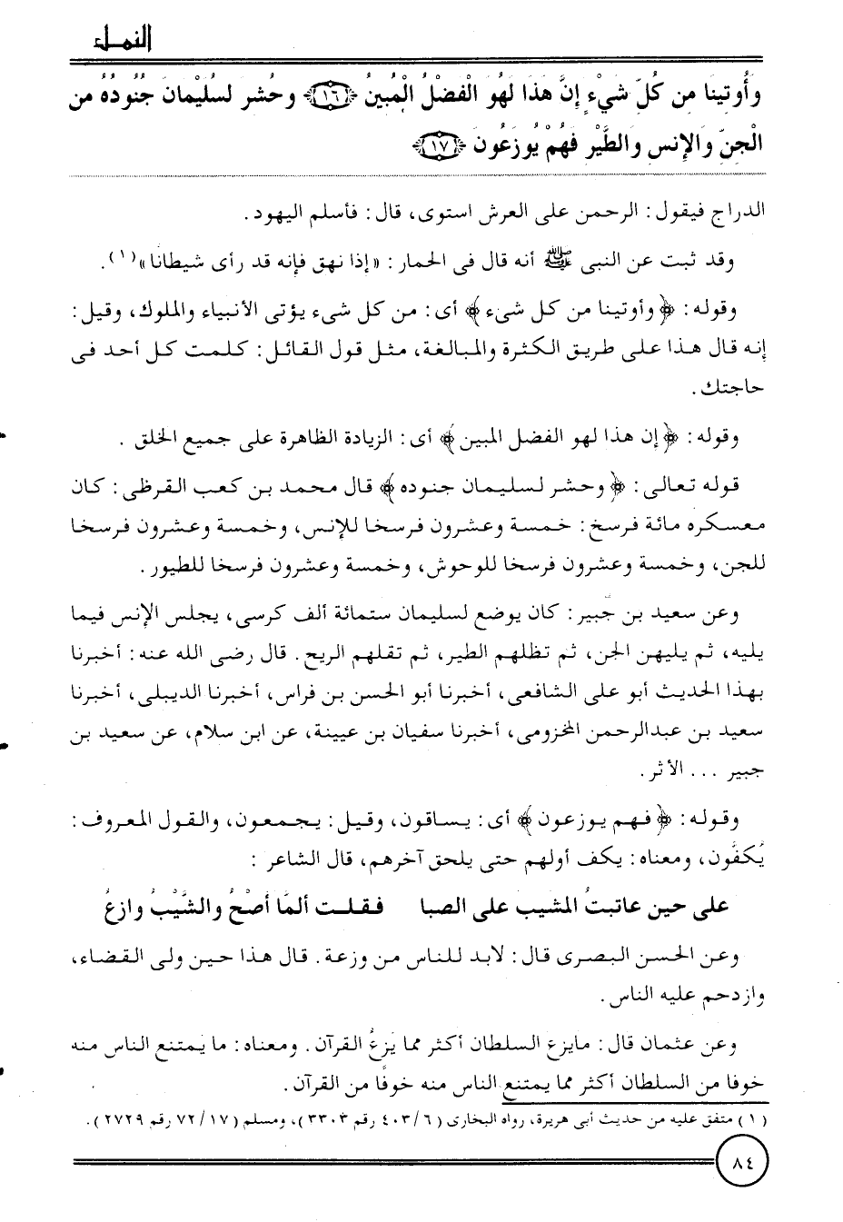 {وأوتينا من كل شَيْء إِن هَذَا لَهو الْفضل الْمُبين (16) وَحشر لِسُلَيْمَان جُنُوده من الْجِنّ وَالْإِنْس وَالطير فهم يُوزعُونَ (17) الدراج فَيَقُول: الرَّحْمَن على الْعَرْش اسْتَوَى، قَالَ: فَأسلم الْيَهُود.