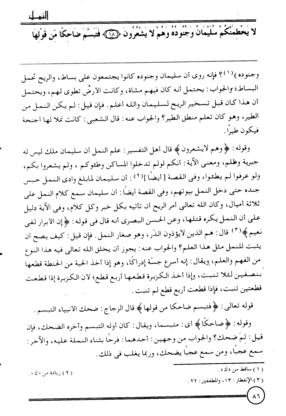 {لَا يحطمنكم سُلَيْمَان وَجُنُوده وهم لَا يَشْعُرُونَ (18) فَتَبَسَّمَ ضَاحِكا من قَوْلهَا وَجُنُوده} ? فَإِنَّهُ روى أَن سُلَيْمَان وَجُنُوده كَانُوا يَجْتَمعُونَ على بِسَاط، وَالرِّيح تحمل الْبسَاط؛ وَالْجَوَاب: يحْتَمل أَنه كَانَ فيهم مشَاة، وَكَانَت الأَرْض تطوى لَهُم، وَيحْتَمل أَن هَذَا كَانَ قبل تسخير الرّيح لِسُلَيْمَان وَالله أعلم. فَإِن قيل: لم يكن النَّمْل من الطير، وَهُوَ كَانَ تعلم منطق الطير؟ وَالْجَوَاب عَنهُ: قَالَ الشّعبِيّ: كَانَت نملا لَهَا أَجْنِحَة فَيكون طيراً.