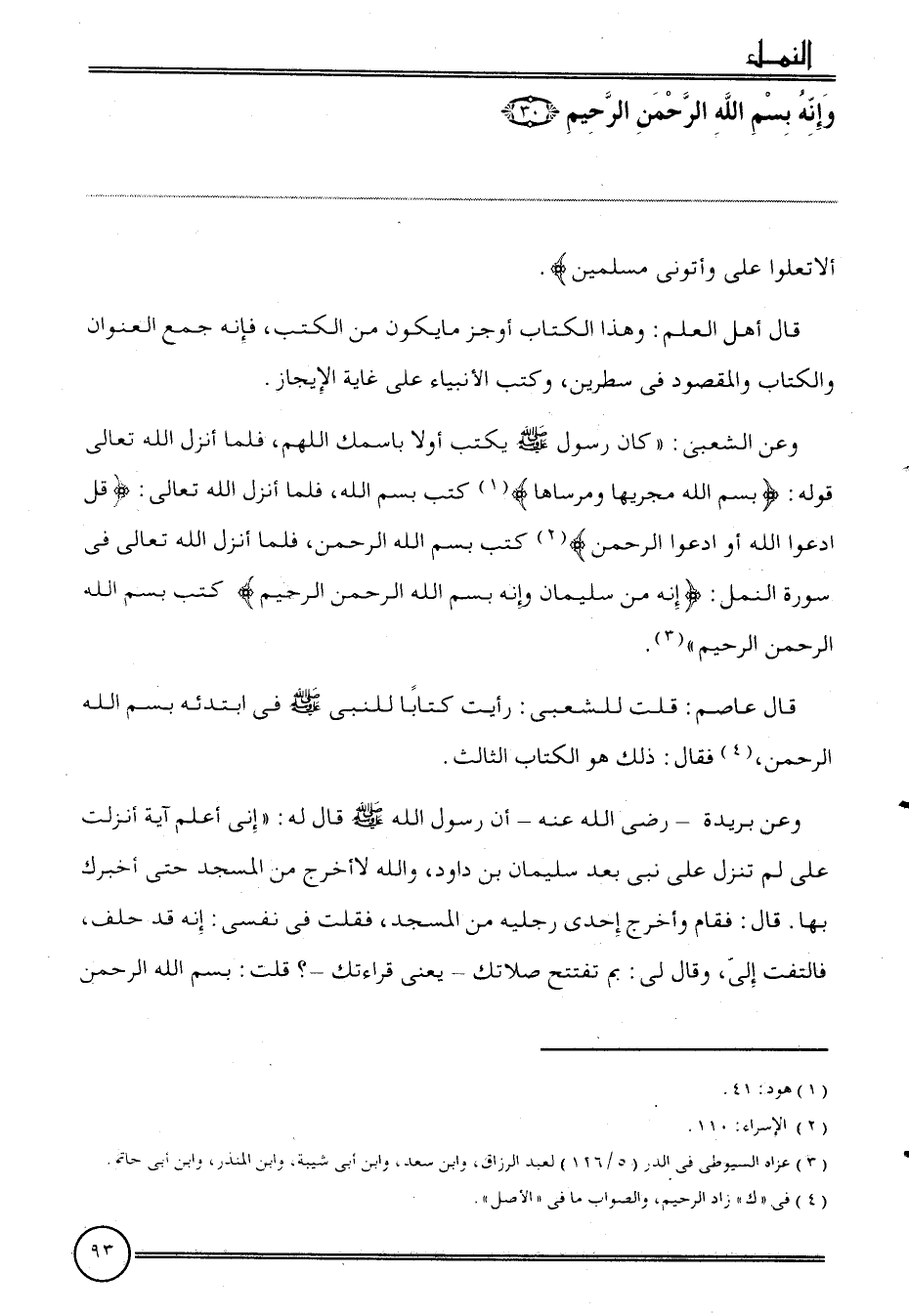 وَعَن الشّعبِيّ: " كَانَ رَسُول يكْتب أَولا بِاسْمِك اللَّهُمَّ، فَلَمَّا أنزل الله تَعَالَى قَوْله: {بِسم الله مجريها وَمرْسَاهَا} كتب بِسم الله، فَلَمَّا أنزل الله تَعَالَى: {قل ادعوا الله أَو ادعوا الرَّحْمَن} كتب بِسم الله الرَّحْمَن، فَلَمَّا أنزل الله تَعَالَى فِي سُورَة النَّمْل: {إِنَّه من سُلَيْمَان وَإنَّهُ بِسم الله الرَّحْمَن الرَّحِيم} كتب بِسم الله الرَّحْمَن الرَّحِيم ".
