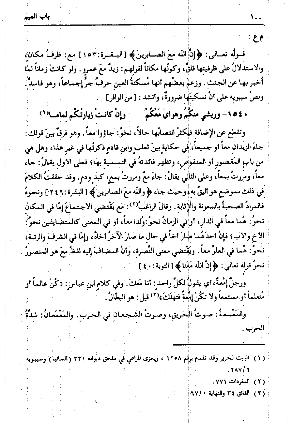 وتقطع عن الإضافة فيكثر انتصابها حالًا، نحو: جاؤوا معًا. وهو فرقٌ بين قولك: جاء الزيدان معًا أو جميعًا، في حكايةٍ بين ثعلبٍ وابن قادمٍ ذكرتها في غير هذا، وهل هي من باب المقصور أو المنقوص، وتظهر فائدته في التسمية بها؛ فعلى الأول يقال: جاء معًا، ومررت بمعًا، وعلى الثاني يقال: جاء معٌ ومررت بمعٍ، كيدٍ ودمٍ. وقد حققت الكلام في ذلك بموضع هو أليق به، وحيث جاء {والله مع الصابرين} [البقرة: 249] ونحوه فالمراد الصحبة بالمعونة والإثابة. وقال الراغب: مع يقتضي الاجتماع إما في المكان نحو: هما معًا في الدار، أو في الزمان نحو: ولدا معًا، أو في المعنى كالمتضايفين نحو: الأخ والأبد؛ فإن أحدهما صار أخًا في حال ما صار الآخر أخاه، وإما في الشرف والرتبة، نحو: هما في العلو معًا. ويقتضي معنى النصرة، وأن المضاف إليه لفظ مع هو المنصور نحو قوله تعالى: {إن الله معنا} [التوبة: 40]
