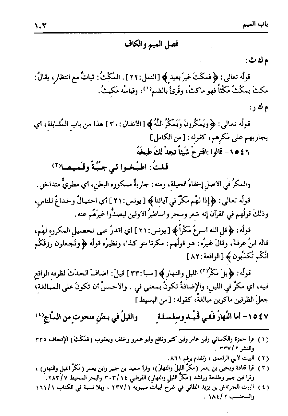 قوله: {بل مكر الليل والنهار} [سبأ:33] قيل: أضاف الحدث لظرفه الواقع فيه، أي مكر في الليل، والإضافة تكون بمعنى في. والأحسن أن تكون على المبالغة؛ جعل الظرفين ماكرين مبالغة، كقوله: [من البسيط]