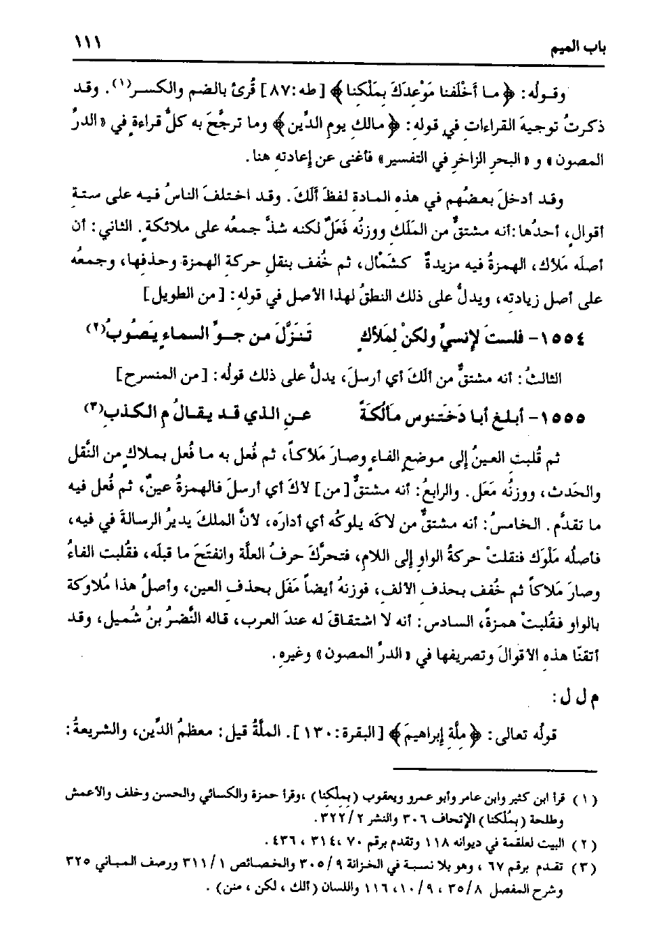 ثم قلبت العين إلى موضع الفاء وصار ملأكًا، ثم فعل به ما فعل بملاك من النقل والحدث، ووزنه معل. والرابع: أنه مشتق من لاكه يلوكه أي أداره، لأن الملك يدير الرسالة في فيه، فأصله ملوك فنقلت حركة الواو إلى اللام، فتحرك حرف العلة وانفتح ما قبله، فقلبت الفاء وصار ملاكًا ثم خفف بحذف الألف، فوزنه أيضًا مفل بحذف العين، وأصل هذا ملاوكة بالواو فقلبت همزة، السادس: أنه لا اشتقاق له عند العرب، قاله النضر بن شميل، وقد أتقنا هذه الأقوال وتصريفها في ((الدر المصون)) وغيره.