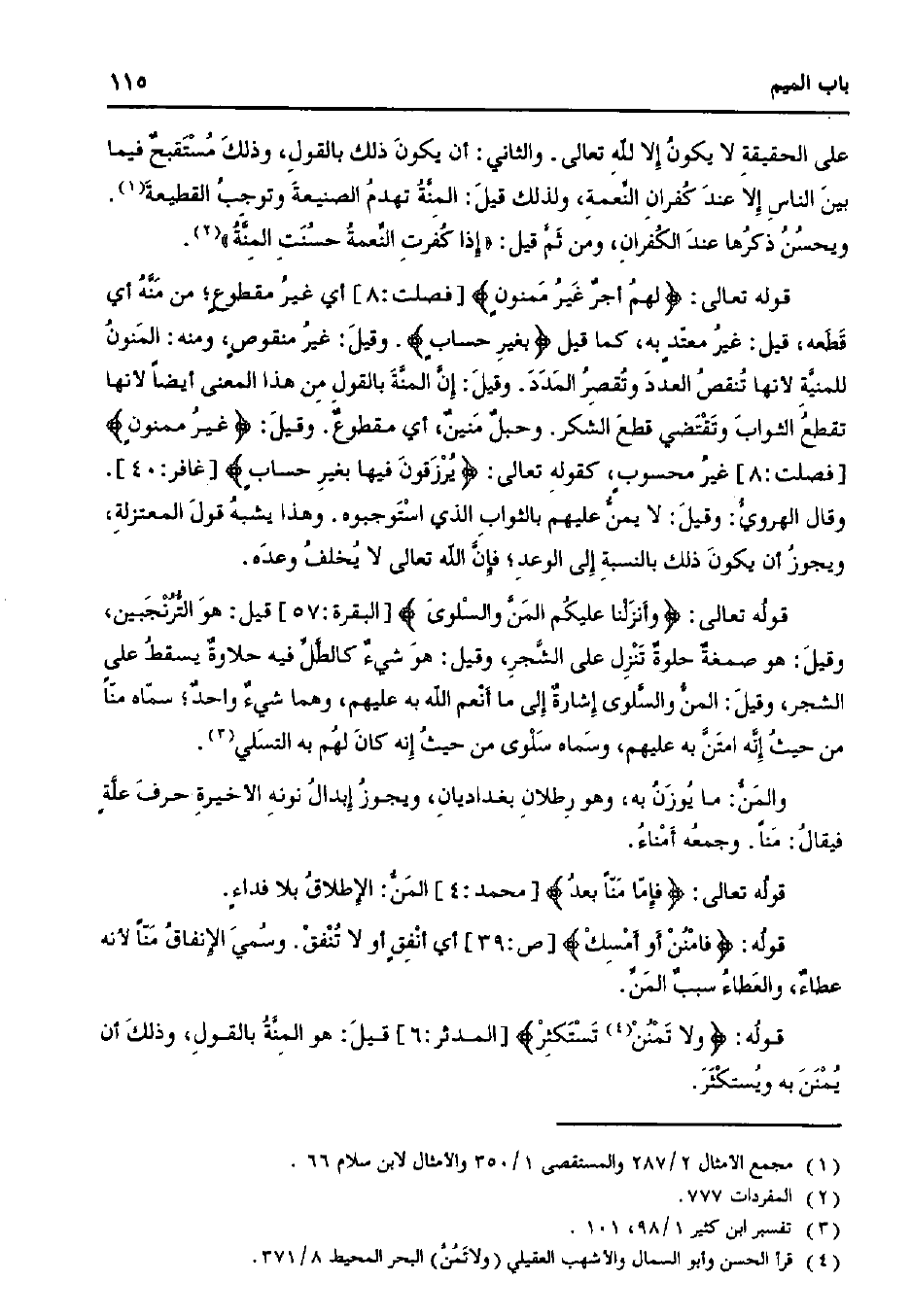قوله تعالى: {لهم أجرٌ غير ممنونٍ} [فصلت: 8] أي غير مقطوعٍ، من منه أي قطعه، قيل: غير معتدٍ به، كما قيل: {بغير حسابٍ}. وقيل: غير منقوصٍ، ومنه: المنون للمنية لأنها تنقص العدد وتقصر المدد. وقيل: إن المنية بالقول من هذا المعنى أيضًا لأنها تقطع الثواب وتقتضي قطع الشكر. وحبلٌ منينٌ، أي مقطوعٌ. وقيل: {غير ممنون} [فصلت: 8] غير محسوبٍ، كقوله تعالى: {يرزقون فيها بغير حساب} [غافر: 40].