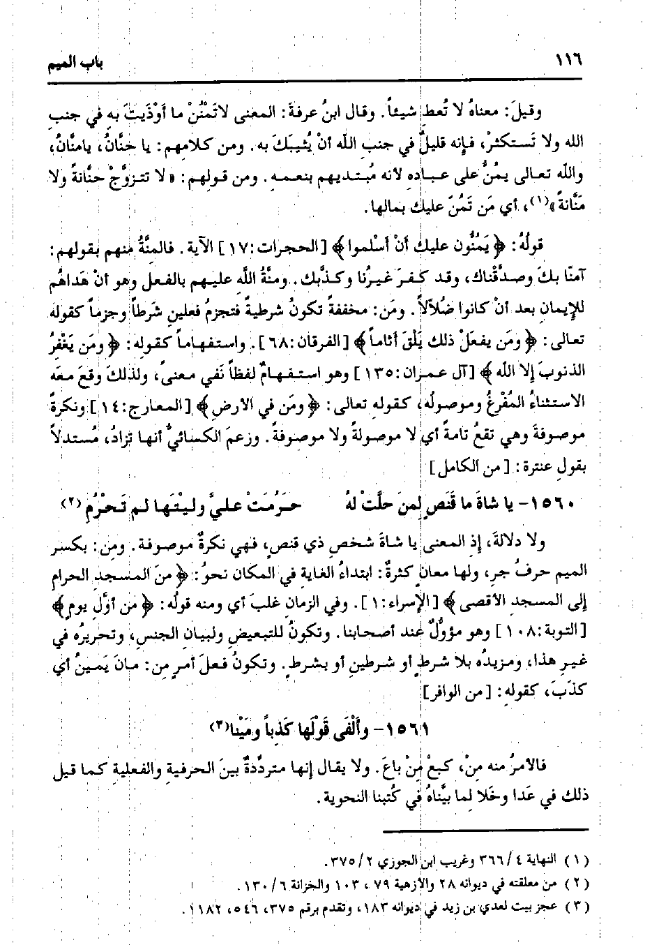 قوله: {يمنون عليك أن أسلموا} [الحجرات: 17] الآية. فالمنة منهم بقولهم: آمنا بك وصدقناك، وقد كفر غيرنا وكذبك. ومنة الله عليهم بالفعل وهو أن هداهم للإيمان بعد أن كانوا ضلالًا. ومن: مخففة تكون شرطيةً فتجزم فعلين شرطًا وجزمًا كقوله تعالى: {ومن يفعل ذلك يلق أثامًا} [الفرقان: 68] واستفهامًا كقوله: {ومن يغفر الذنوب إلا الله} [آل عمران: 135] وهو استفهامٌ لفظًا نفي معنى، ولذلك وقع معه الاستثناء المفرغ وموصولة، كقوله تعالى: {ومن في الأرض} [المعارج: 14] ونكرةً موصوفة، وهي تقع تامةً أي موصولةً لا موصوفةً. وزعم الكسائي أنها تزداد، مستدلًا بقول عنترة: [من الكامل].