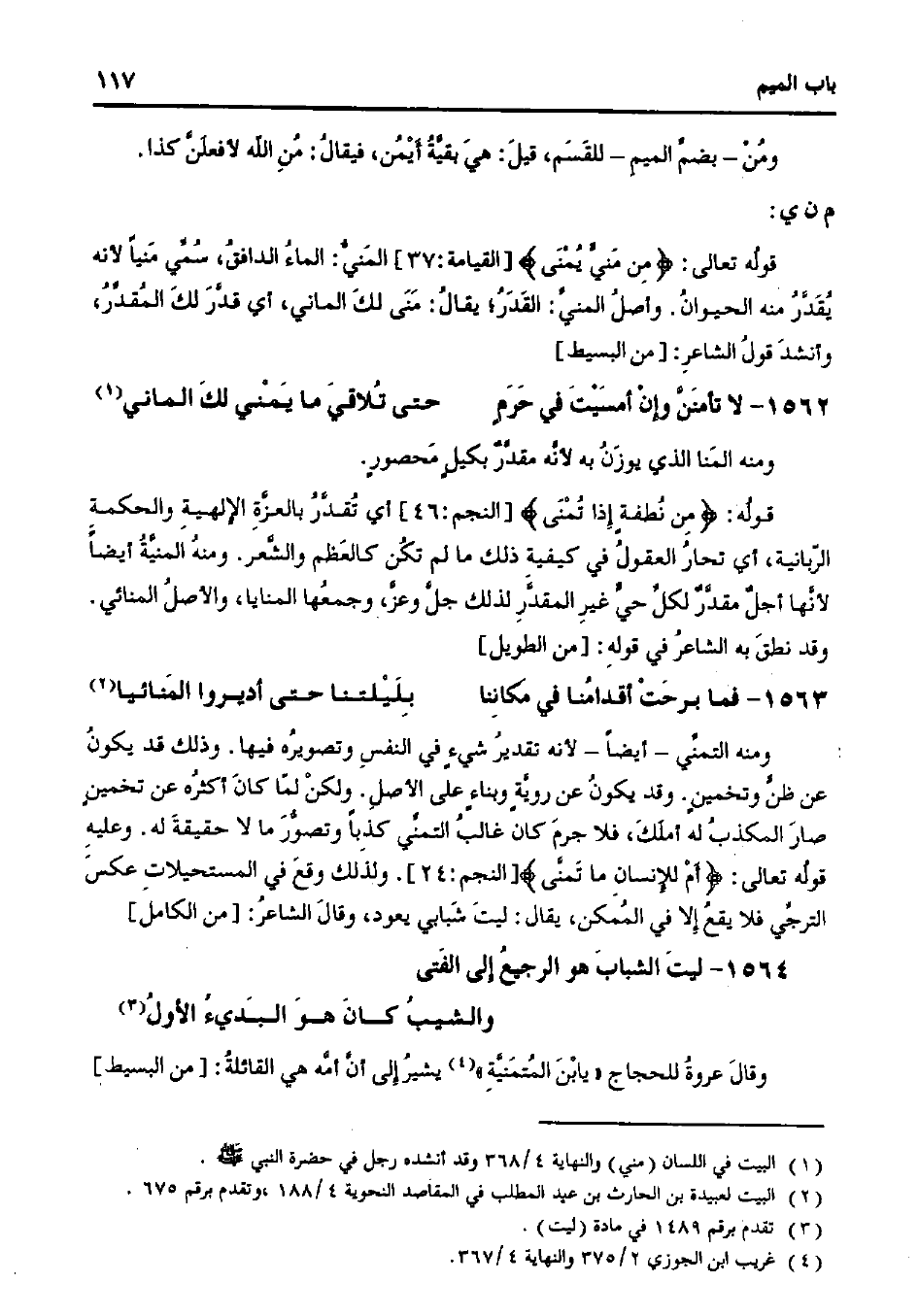 قوله: {من نطفةٍ إذا تمنى} [النجم: 46] أي تقدر بالعزة الإلهية والحكمة الربانية، أي تحار العقول في كيفية ذلك ما لم تكن كالعظم والشعر. ومنه المنية أيضًا لأنها أجلٌ مقدرٌ لكل حيً غير المقدر لذلك جل وعز، وجمعها المنايا، والأصل المنائي، وقد نطق به الشاعر في قوله: [من الطويل].