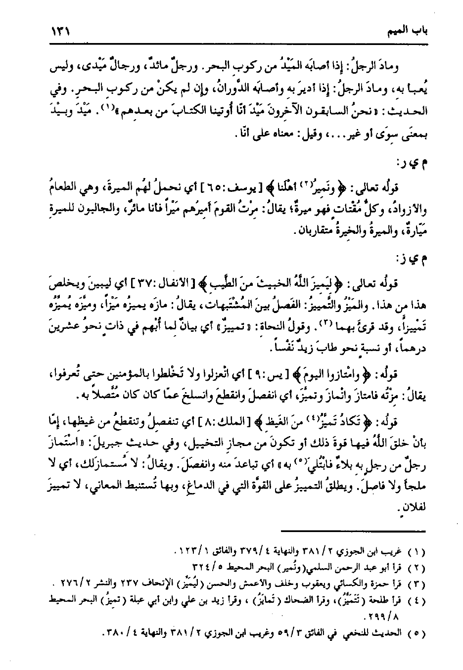 قوله: {تكاد تميز من الغيظ} [الملك:8] أي تنفصل وتنقطع من غيظها، إما بأن خلق الله فيها قوة ذلك أو تكون من مجاز التخييل، وفي حديث جبريل: ((استماز رجل من رجل به بلاء فابتلي به)) أي تباعد منه وانفصل. ويقال: لا مستمازلك، أي لا ملجأ ولا فاصل. ويطلق التمييز على القوة التي في الدماغ، وبها تستنبط المعاني، لا تمييز لفلان.