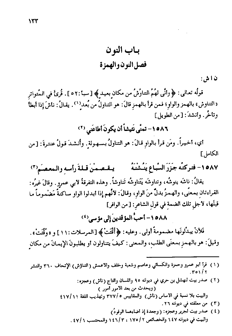 قوله تعالى: {وأنى لهم التناوش من مكان بعيد} [سبأ:52]. قرئ في المتواتر ((التناوش)) بالهمز والواو؛ فمن قرأ بالهمز قال: هو التناول من بعد. يقال: ناش إذا أبطأ وتأخر. وأنشد: [من الطويل]