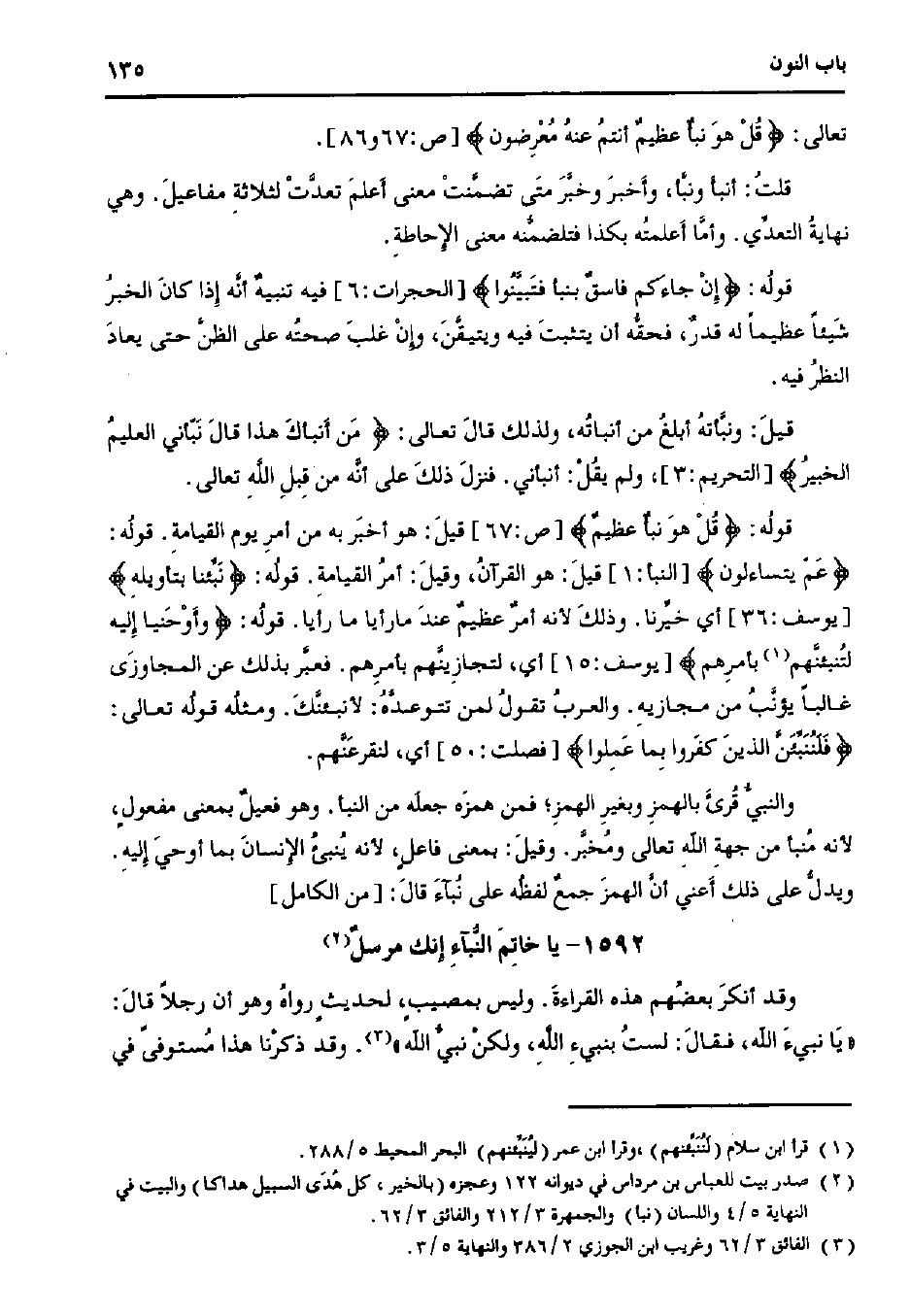 قوله: {قل هو نبأ عظيم} [ص:67] قيل: هو أخبر به من أمر يوم القيامة. قوله: {عم يتساءلون} [النبأ:1] قيل: هو القرآن، وقيل: أمر القيامة. قوله: {نبئنا بتأويله} [يوسف:36] أي خيرنا. وذلك لأنه أمر عظيم عند ما رأيا ما رأيا. قوله: {وأوحينا إليه لتنبئنهم بأمرهم} [يوسف:15] أي، لتجازينهم بأمرهم. فعبر بذلك عن المجاوزى غالبًا يؤنب من مجازيه. والعرب تقول لمن تتوعده: لأنبئنك. ومثله قوله تعالى: {فلننبئن الذين كفروا بما عملوا} [فصلت:50] أي، لنقرعنهم.