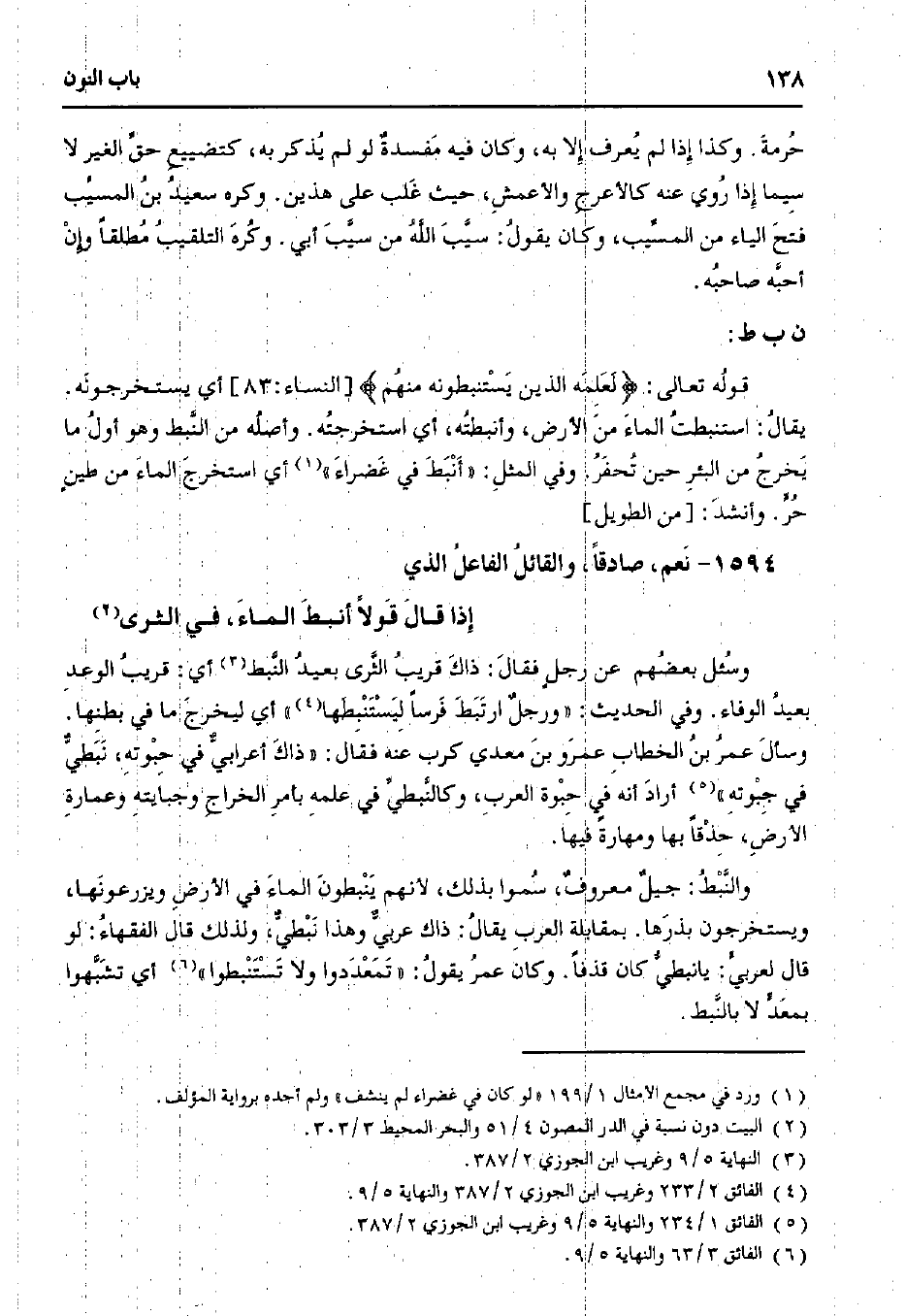 قوله تعالى: {لعلمه الذين يستنبطونه منهم} [النساء:83] أي يستخرجونه. يقال: استنبطت الماء من الأرض، وأنبطته، أي استخرجته. وأصله من النبط وهو أول ما يخرج من البئر حين تحفر. وفي المثل: ((أنبط في غضراء)) أي استخراج الماء من طين حر. وأنشد: [من الطويل]