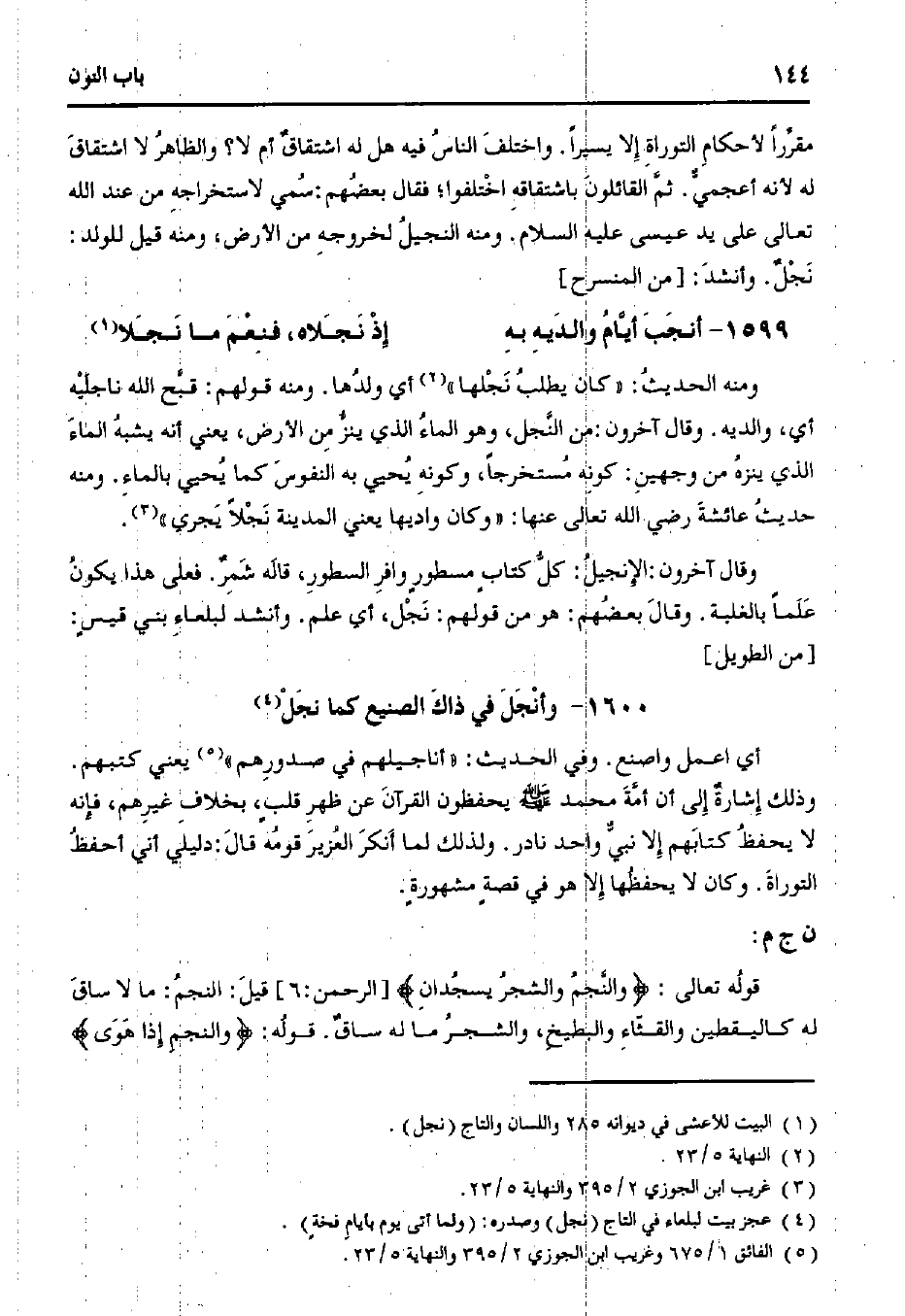وقال آخرون: الإنجيل: كل كتاب مسطور وافر السطور، قاله شمر. فعلى هذا يكون علما بالغلبة. وقال بعضهم: هو من قولهم: نجل، أي علم. وأنشد لبلعاء بني قيس: [من الطويل]