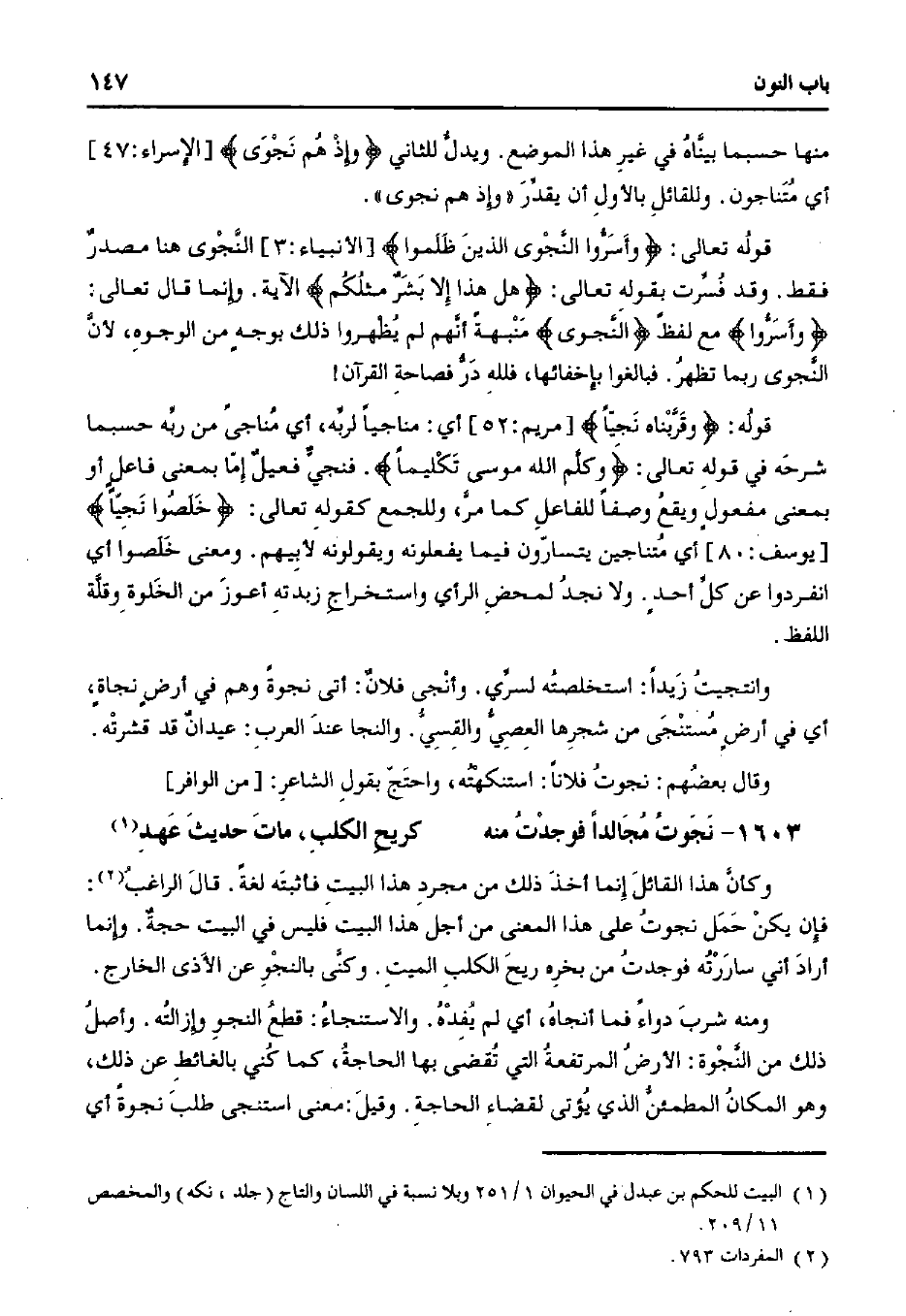 وكأن هذا القائل إنما أخذ ذلك من أجل هذا البيت فليس في البيت حجة. وإنما أراد أني ساررته فوجدت من بخره ريح الكلب الميت. وكنى بالنجو عن الأذى الخارج. ومنه شرب دواء فما أنجاه، أي لم يفده. والاستنجاء: قطع النجو وإزالته. وأصل ذلك من النجوة: الأرض المرتفعة التي تقضي بها الحاجة، كما كنى بالغائط عن ذلك، وهو المكان المطمئن الذي يؤتى لقضاء الحاجه. وقيل: معني استنجى طلب نجوة أي