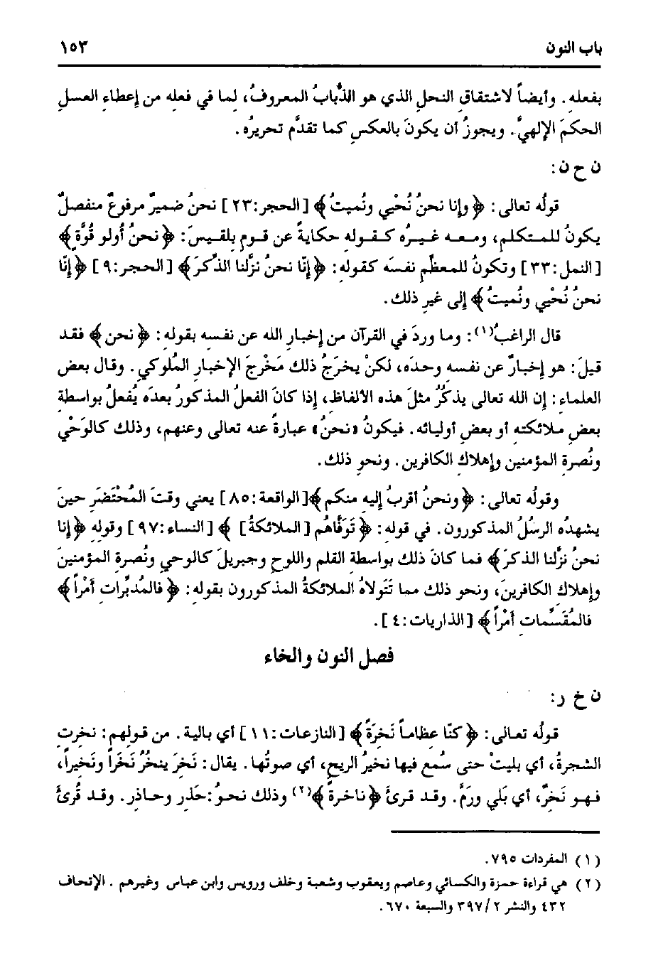 قال الراغب: وما ورد في القرآن من إخبار الله عن نفسه بقوله: {نحن} فقد قيل: هو إخبار عن نفسه وحده، لكن يخرج ذلك مخرج الإخبار الملوكي. وقال بعض العلماء: إن الله تعالى يذكر مثل هذه الألفاظ، إذا كان الفعل المذكور بعده يفعل بواسطة بعض ملائكته أو بعض أولياته. فيكون ((نحن)) عبارًة عنه تعالى وعنهم، وذلك كالوحي ونصرة المؤمنين وإهلاك الكافرين. ونحو ذلك.