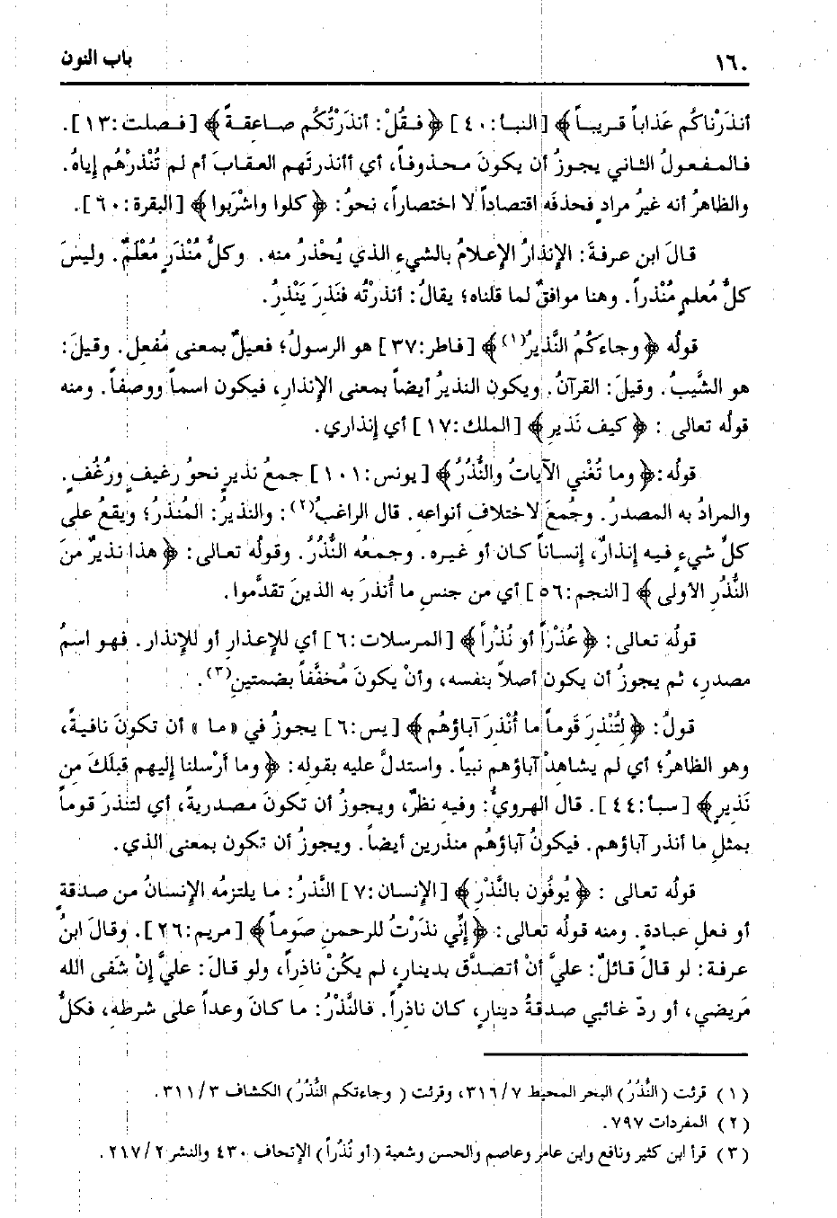 قوله: {وما تغني الآيات والنذر} [يونس: 101] جمع نذيرٍ نحو رغيفٍ ورغفٍ. والمراد به المصدر. وجمعٍ لاختلاف أنواعه. قال الراغب: والنذير: المنذر؛ ويقع على كل شيءٍ فيه إنذار، إنسانًا كان أو غيره. وجمعه النذر. وقوله تعالى: {هذا نذير من النذر الأولى} [النجم: 56] أي من جنس ما أنذر به الذين تقدموا.